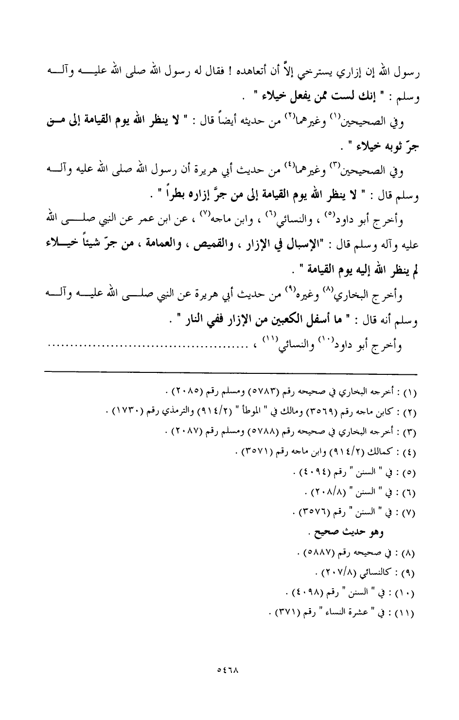 وفي الصحيحين (¬3) وغيرهما (¬4) من حديث أبي هريرة أن رسول الله صَلَّى اللهُ عَلَيْهِ وَآلِهِ وَسَلَّمَ قال: " لا ينظر الله يوم القيامة إلى من جر إزاره بطرا ".