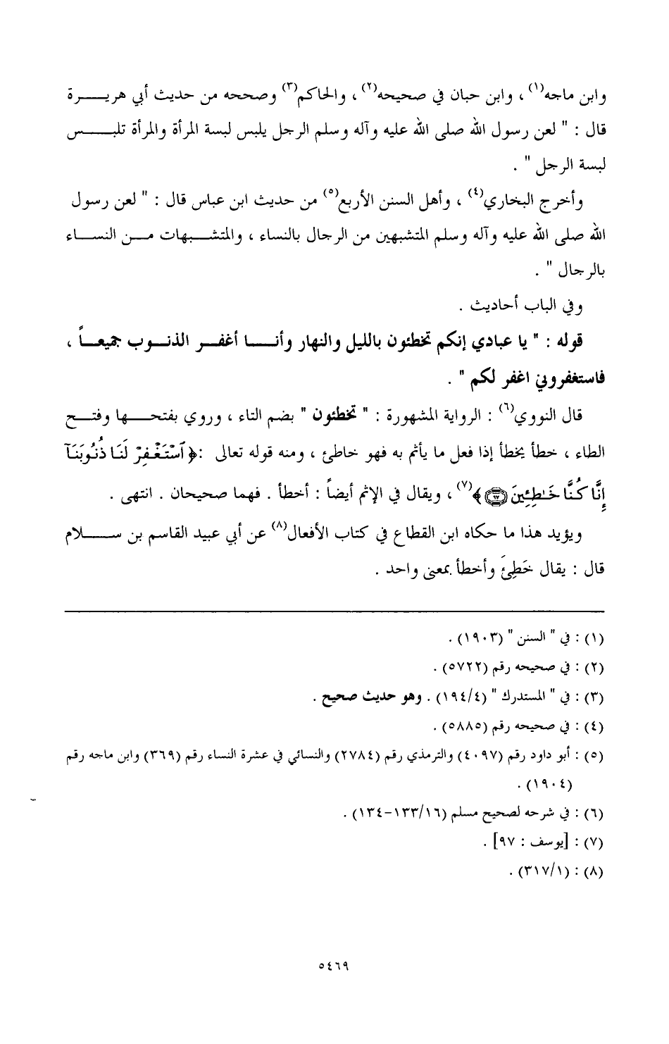 قال النووي (¬6) الرواية المشهورة: " تخطئون " بضم التاء، وروي بفتحها وفتح الطاء، خطأ يخطأ إذا فعل ما يأثم به فهو خاطئ، ومنه قوله تعالى: {اسْتَغْفِرْ لَنَا ذُنُوبَنَا إِنَّا كُنَّا خَاطِئِينَ} (¬7)، ويقال في الإثم أيضا: أخطأ. فهما صحيحان. انتهى.
