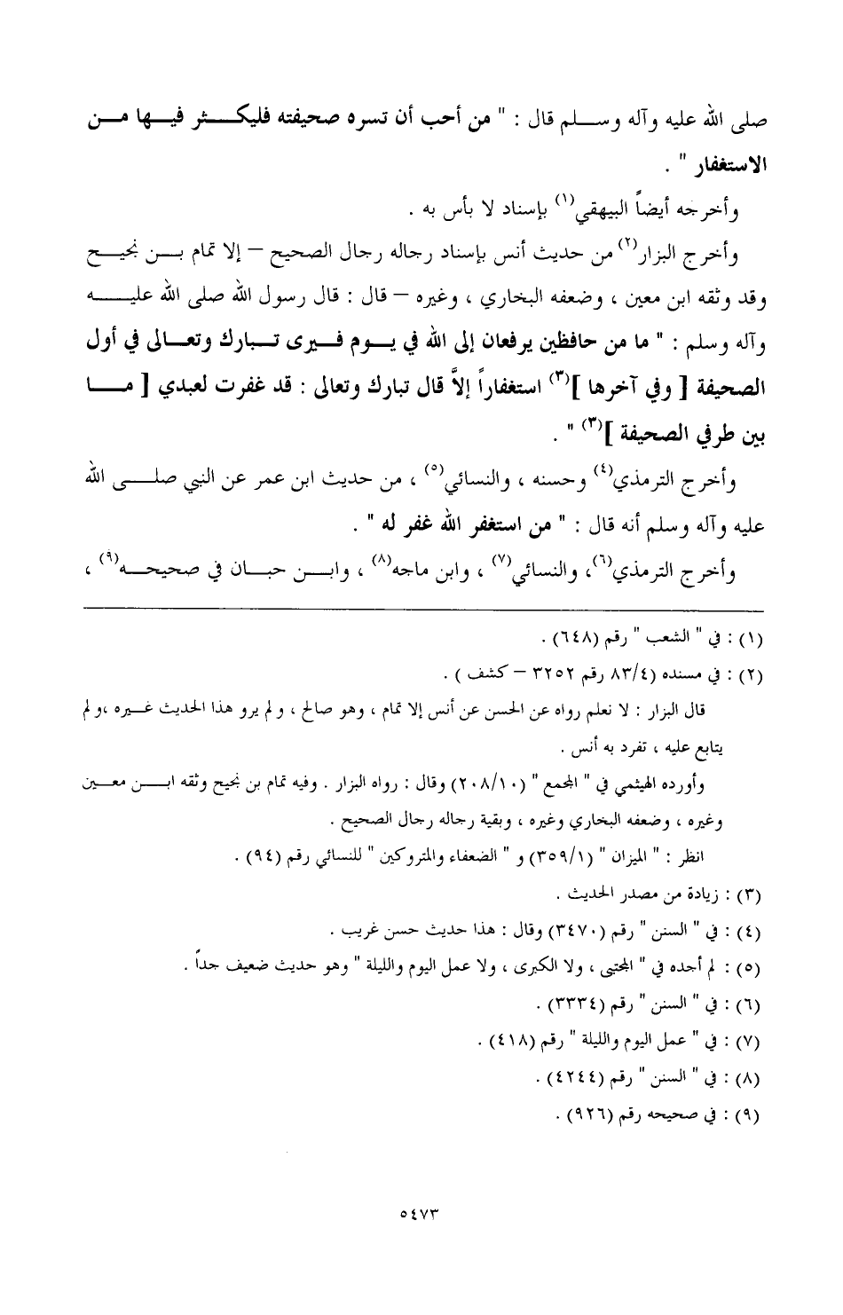 صَلَّى اللهُ عَلَيْهِ وَآلِهِ وَسَلَّمَ قال: " من أحب أن تسره صحيفته فليكثر فيها من الاستغفار ".