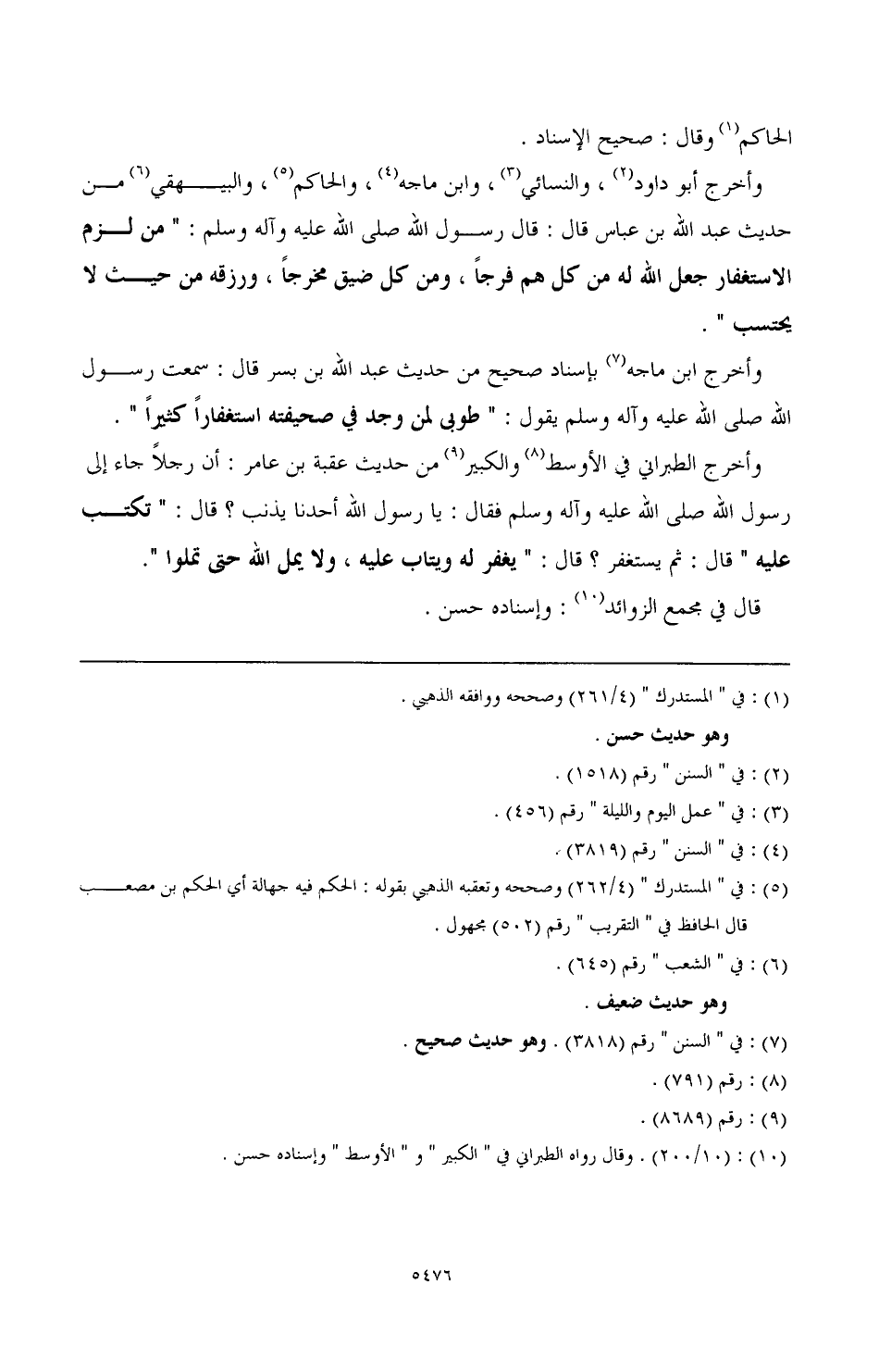 وأخرج أبو داود (¬2)، والنسائي (¬3)، وابن ماجه (¬4)، والحاكم (¬5) والبيهقي (¬6) من حديث عبد الله بن عباس قال: قال رسول الله صَلَّى اللهُ عَلَيْهِ وَآلِهِ وَسَلَّمَ: " من لزم الاستغفار جعل الله له من كل هم فرجا، ومن كل ضيق مخرجا، ورزقه من حيث لا يحتسب ".
