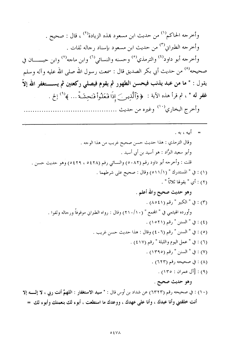وأخرجه أبو داود (¬4) والترمذي (¬5) وحسنه والنسائي (¬6) وابن ماجه (¬7) وابن حبان في صحيحه (¬8) من حديث أبي بكر الصديق قال: سمعت رسول الله صَلَّى اللهُ عَلَيْهِ وَآلِهِ وَسَلَّمَ يقول: " ما من عبد يذنب فيحسن الطهور ثم يقوم فيصلي ركعتين ثم يستغفر الله إلا غفر له "، ثم قرأ هذه الآية: {وَالَّذِينَ إِذَا فَعَلُوا فَاحِشَةً} (¬9) إلخ.