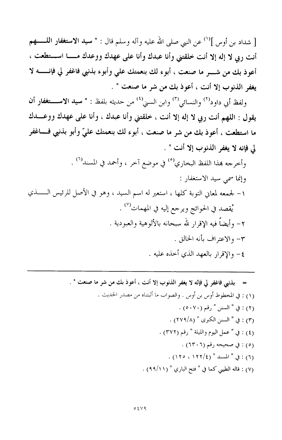[شداد بن أوس] (¬1) عن النبي صَلَّى اللهُ عَلَيْهِ وَآلِهِ وَسَلَّمَ قال: " سيد الاستغفار اللهم أنت ربي لا إله إلا أنت خلقتني وأنا عبدك وأنا على عهدك ووعدك ما استطعت، أعوذ بك من شر ما صنعت، أبوء لك بنعمتك علي وأبوء بذنبي فاغفر لي فإنه لا يغفر الذنوب إلا أنت، أعوذ بك من شر ما صنعت ".