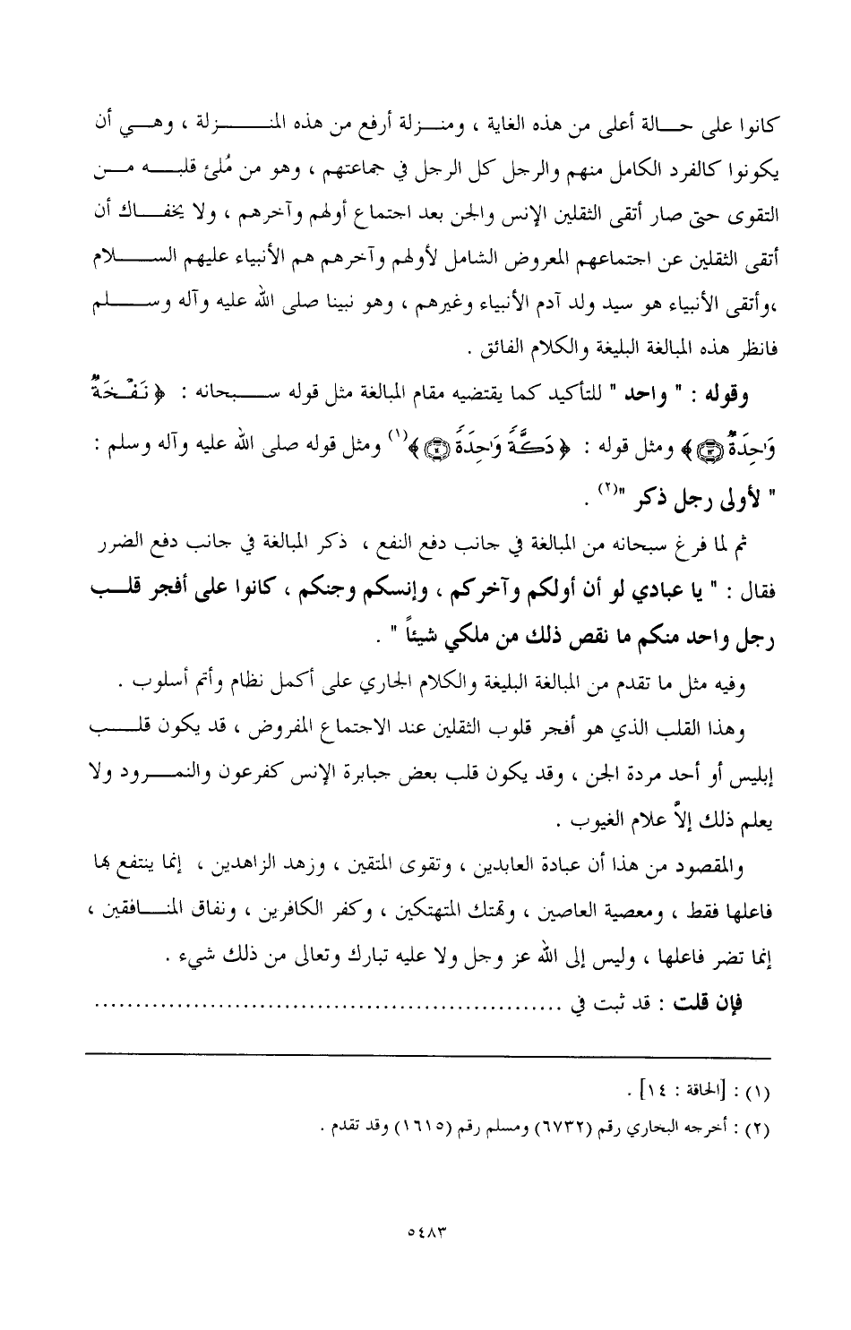 وقوله: " واحد " للتأكيد كما يقتضيه مقام المبالغة مثل قوله سبحانه: {نَفْخَةٌ وَاحِدَةٌ} ومثل قوله: {دَكَّةً وَاحِدَةً} (¬1) ومثل قوله صَلَّى اللهُ عَلَيْهِ وَآلِهِ وَسَلَّمَ: " لأولى رجل ذكر " (¬2).