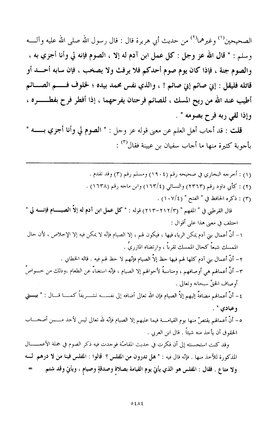 قلت: قد أجاب أهل العلم عن معنى قوله عز وجل: " الصوم لي وأنا أجزي به " بأجوبة كثيرة منها ما أجاب سفيان بن عيينة فقال (¬3)