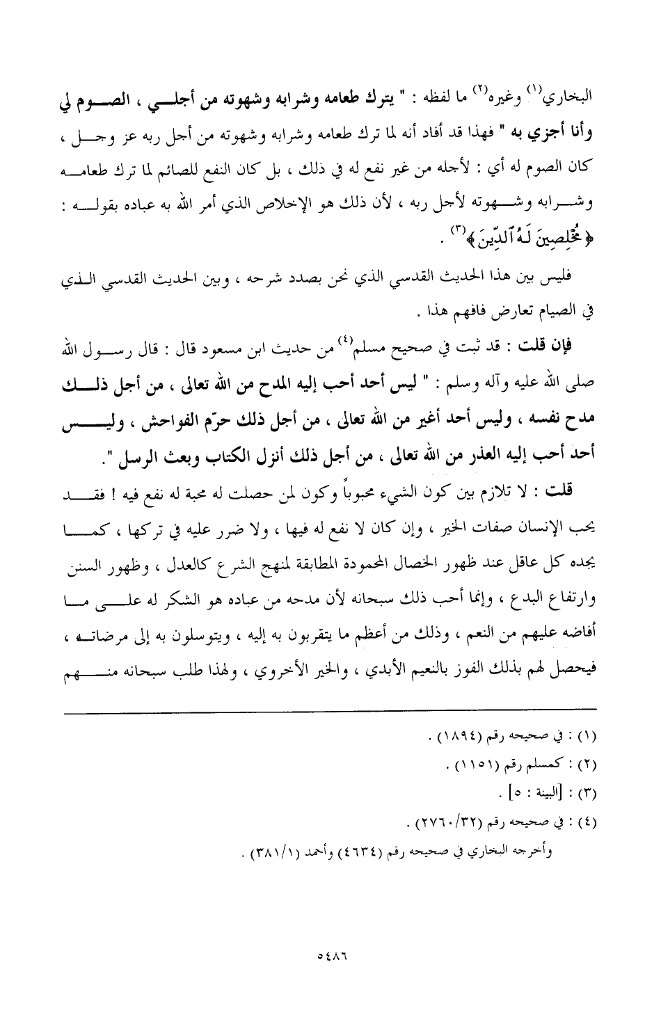 البخاري (¬1) وغيره (¬2) ما لفظه: " يترك طعامه وشرابه وشهوته من أجلي، الصوم لي وأنا أجزي به " فهذا قد أفاد أنه لما ترك طعامه وشرابه وشهوته من أجل ربه عز وجل، كان الصوم له أي: لأجله من غير نفع له في ذلك، بل كان النفع للصائم لما ترك طعامه وشرابه وشهوته لأجل ربه، لأن ذلك هو الإخلاص الذي أمر الله به عباده بقوله: {مُخْلِصِينَ لَهُ الدِّينَ} (¬3).
