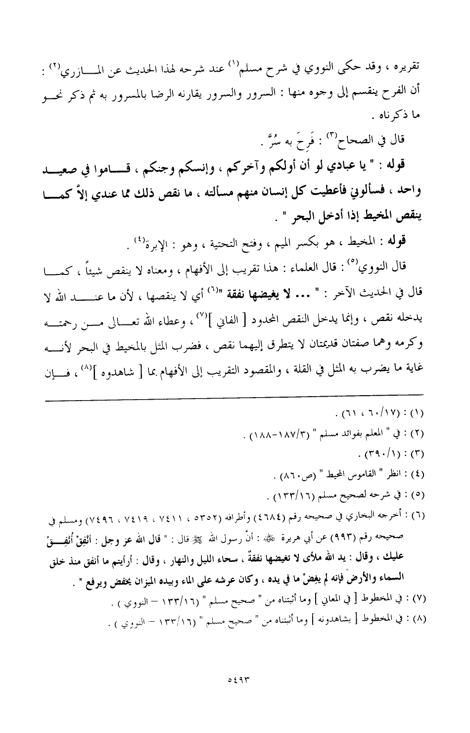 قال النووي (¬5) قال العلماء: هذا تقريب إلى الأفهام، ومعناه لا ينقص شيئا، كما قال في الحديث الآخر: " ... لا يغيضها نفقة" (¬6) أي لا ينقصها، لأن ما عند الله لا يدخله نقص، وإنما يدخل النقص المحدود [الفاني] (¬7)، وعطاء الله تعالى من رحمته وكرمه وهما صفتان لا يتطرق إليهما نقص، فضرب المثل بالمخيط في البحر لأنه غاية ما يضرب به المثل في القلة، والمقصود التقريب إلى الأفهام بما [شاهدوه] (¬8)، فإن