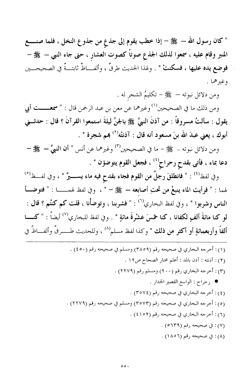 "كان رسول الله- صَلَّى اللهُ عَلَيْهِ وَسَلَّمَ- إذا خطب يقوم إلى جذع من جذوع النخل، فلما صنع المنبر وقام عليه، سمعوا لذلك الجذع صوتا كصوت العشار، حتى جاء النبي -صَلَّى اللهُ عَلَيْهِ وَسَلَّمَ- فوضع يده عليها، فسكنت". ولهذا الحديث طرق، وألفاظ ثابتة في الصحيحين وغيرهما.