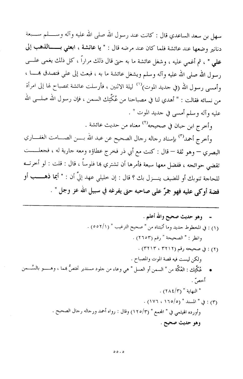 سهل بن سعد الساعدي قال: كانت عند رسول الله صَلَّى اللهُ عَلَيْهِ وَآلِهِ وَسَلَّمَ سبعة دنانير وضعها عند عائشة فلما كان عند مرضه قال: "يا عائشة، ابعثي بالذهب إلى علي"، ثم أغمي عليه، وشغل عائشة ما به حتى قال ذلك مرارا، كل ذلك يغمى على رسول الله صَلَّى اللهُ عَلَيْهِ وَآلِهِ وَسَلَّمَ ويشغل عائشة ما به، فبعث إلى علي فتصدق بها، وأمسى رسول الله (في جديد الموت) (¬1) ليلة الاثنين، فأرسلت عائشة بمصباح لها إلى امرأة من نسائه فقالت: "أهدي لنا في مصباحنا من عكتك السمن، فإن رسول الله صَلَّى اللهُ عَلَيْهِ وَآلِهِ وَسَلَّمَ أمسى في جديد الموت".