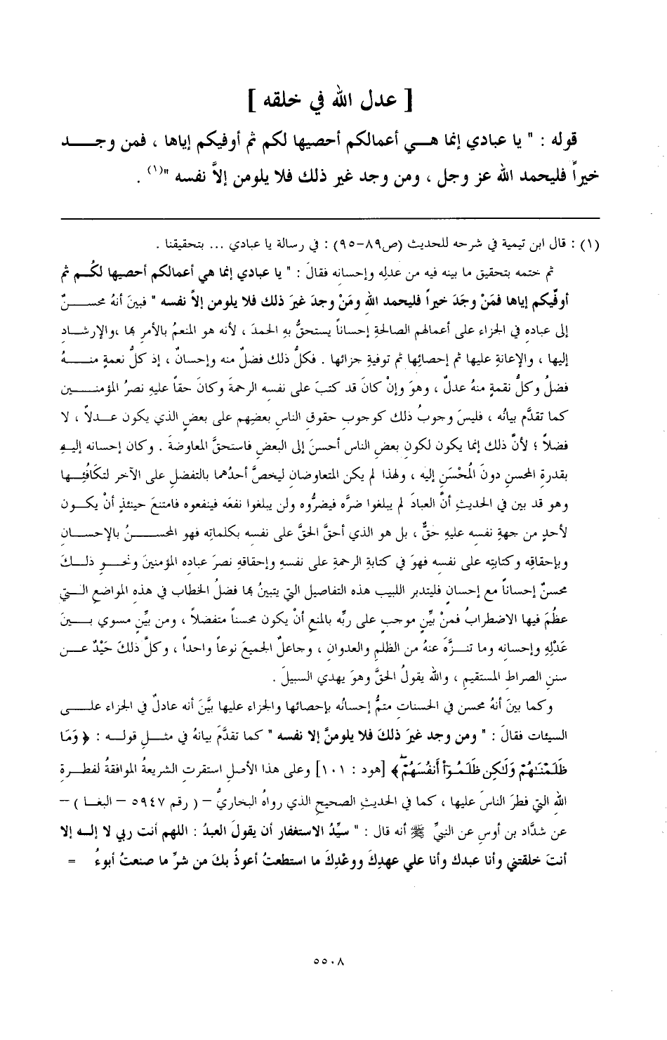 ثم ختمه بتحقيق ما بينه فيه من عدله وإحسانه فقال:" يا عبادي إنما هي أعمالكم أحصيها لكم ثم أوفيكم إياها فمن وجد خيرا فليحمد الله ومن وجد غير ذلك فلا يلومن إلا نفسه" فبين أنه محسن إلى عباده في الجزاء على أعمالهم الصالحة إحسانا يستحق به الحمد؛ لأنه هو المنعم بالأمر بها، والإرشاد إليها، والإعانة عليها ثم إحصائها ثم توفية جزائها. فكل ذلك فضل منه وإحسان، إذ كل نعمة منه فضل وكل نقمة منه عدل، وهو وإن كان قد كتب على نفسه الرحمة وكان حقا عليه نصر المؤمنين كما تقدم بيانه، فليس وجوب ذلك كوجوب حقوق الناس بعضهم على بعض الذي يكون عدلا لا فضلا؛ لأن ذلك إنما يكون لكون بعض الناس أحسن إلى البعض فاستحق المعاوضة، وكان إحسانه إليه بقدرة المحسن دون المحسن إليه، ولهذا لم يكن المتعاوضان ليخص أحدهما بالتفضل على الآخر لتكافئها، وهو قد بين في الحديث أن العباد لم يبلغوا ضره فيضروه ولن يبلغوا نفعه فينفعوه فامتنع حينئذ أن يكون لأحد من جهة نفسه عليه حق، بل هو الذي أحق الحق على نفسه بكلماته فهو المحسن بالإحسان وبإحقاقه وكتابته على نفسه فهو في كتابة الرحمة على نفسه وإحقاقه نصر عباده المؤمنين ونحو ذلك محسن إحسانا مع إحسان فليتدبر اللبيب هذه التفاصيل التي يتبين بها فصل الخطاب في هذه المواضع التي عظم فيها الاضطراب فمن بين موجب على ربه بالمنع أن يكون محسنا متفضلا، ومن بين مسوي بين عدله وإحسانه وما تنزه عنه من الظلم والعدوان، وجاعل الجميع نوعا واحدا، وكل ذلك حيد عن سنن الصراط المستقيم، والله يقول الحق وهو يهدي السبيل.