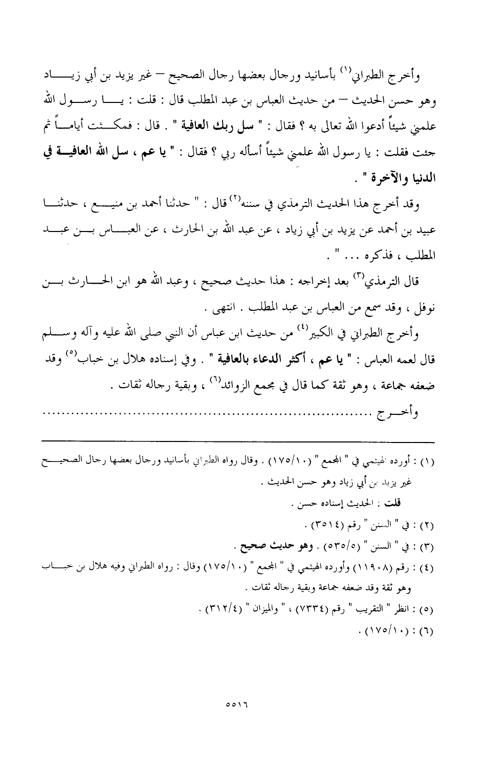 وأخرج الطبراني في الكبير (¬4) من حديث ابن عباس أن النبي صَلَّى اللهُ عَلَيْهِ وَآلِهِ وَسَلَّمَ قال لعمه العباس: "يا عم، أكثر الدعاء بالعافية". وفي إسناده هلال بن خباب (¬5) وقد ضعفه جماعة، وهو ثقة كما قال في مجمع الزوائد (¬6)، وبقية رجاله ثقات.