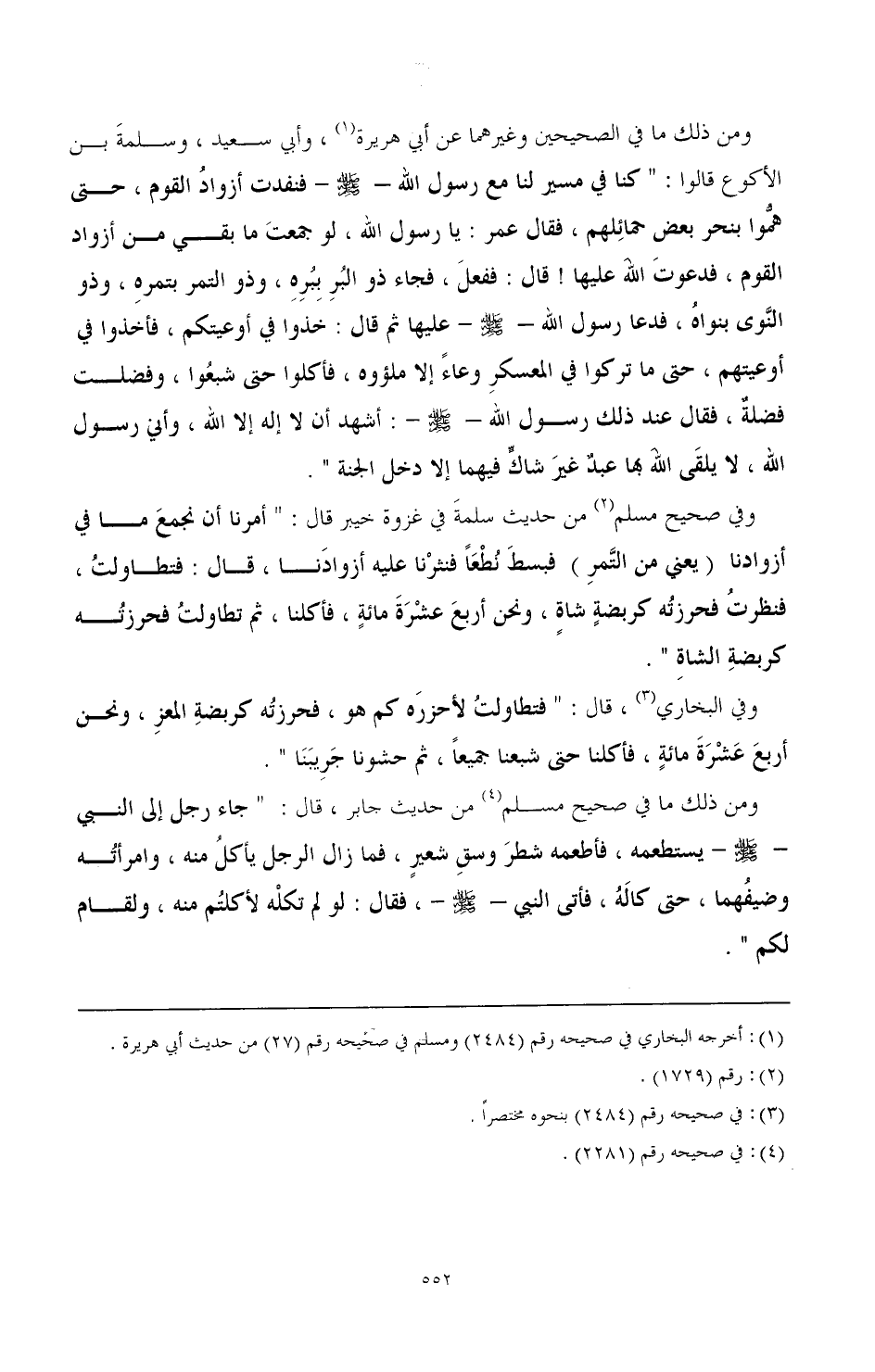 ومن ذلك ما في الصحيحين وغيرهما عن أبي هريرة (¬1)، وأبي سعيد، وسلمة بن الأكوع قالوا: "كنا في مسير لنا مع رسول الله -صَلَّى اللهُ عَلَيْهِ وَسَلَّمَ- فنفدت أزواد القوم، حتى هموا بنحر بعض حمائلهم، فقال عمر: يا رسول الله، لو جمعت ما بقي من أزواد القوم، فدعوت الله عليها! قال: ففعل، فجاء ذو البر ببره، وذو التمر بتمره، وذو النوى بنواه، فدعا رسول الله - صَلَّى اللهُ عَلَيْهِ وَسَلَّمَ- عليها ثم قال: خذوا في أوعيتكم، فأخذوا في أوعيتهم، حتى ما تركوا في المعسكر وعاء إلا ملئوه، فأكلوا حتى شبعوا، وفضلت فضلة، فقال عند ذلك رسول الله -صَلَّى اللهُ عَلَيْهِ وَسَلَّمَ-: أشهد أن لا إله إلا الله، وأني رسول الله، لا يلقى الله بها عبد غير شاك فيهما إلا دخل الجنة".