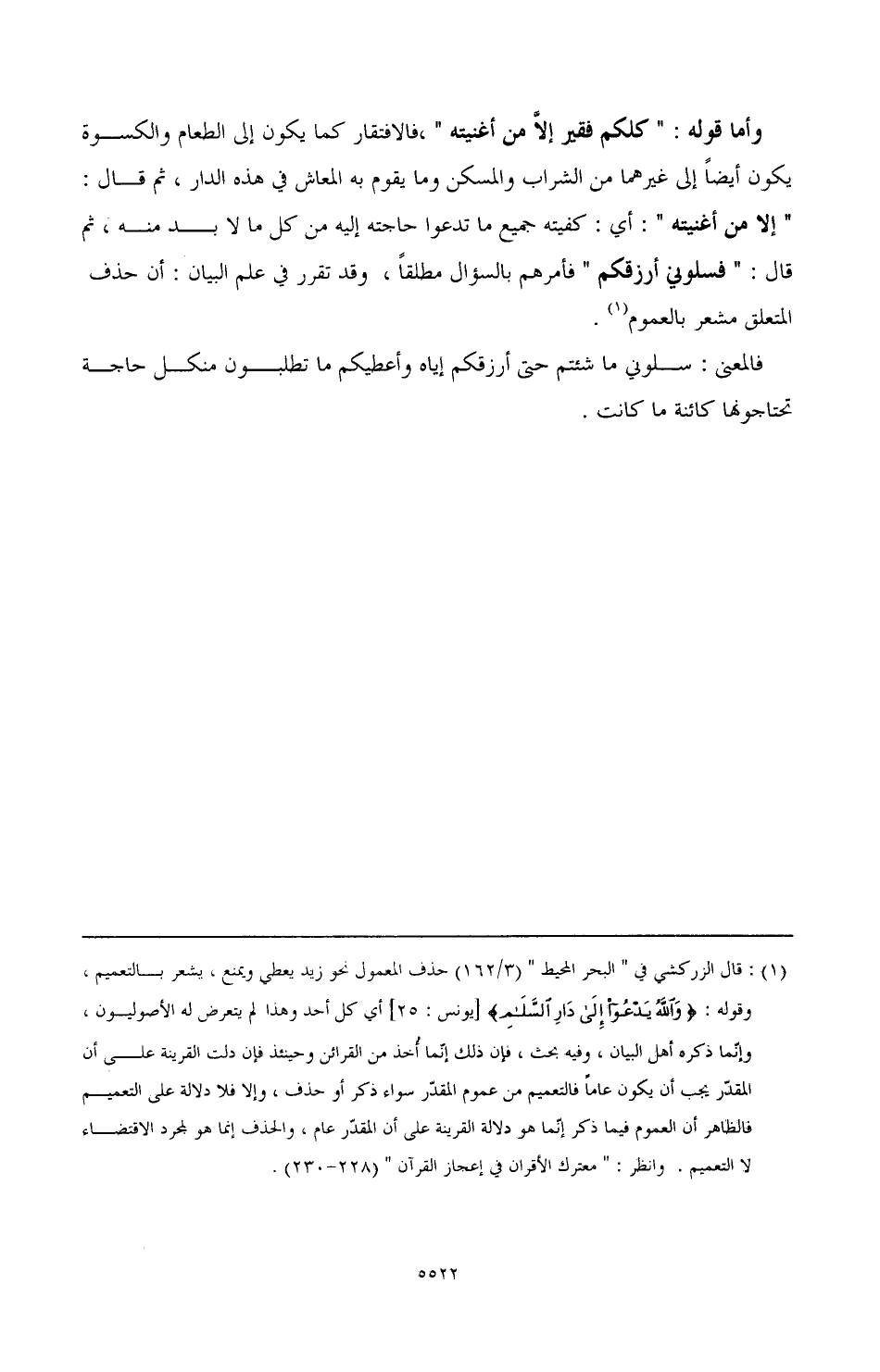 وأما قوله:" كلكم فقير إلا من أغنيته"، فالافتقار كما يكون إلى الطعام والكسوة يكون أيضًا إلى غيرهما من الشراب والمسكن وما يقوم به المعاش في هذه الدار، ثم قال: "إلا من أغنيته": أي " كفيته جميع ما تدعوا حاجته إليه من كل ما لا بد منه، ثم قال:" فسلوني أرزقكم" فأمرهم بالسؤال مطلقا، وقد تقرر في علم البيان: أن حذف المتعلق مشعر بالعموم (¬1).