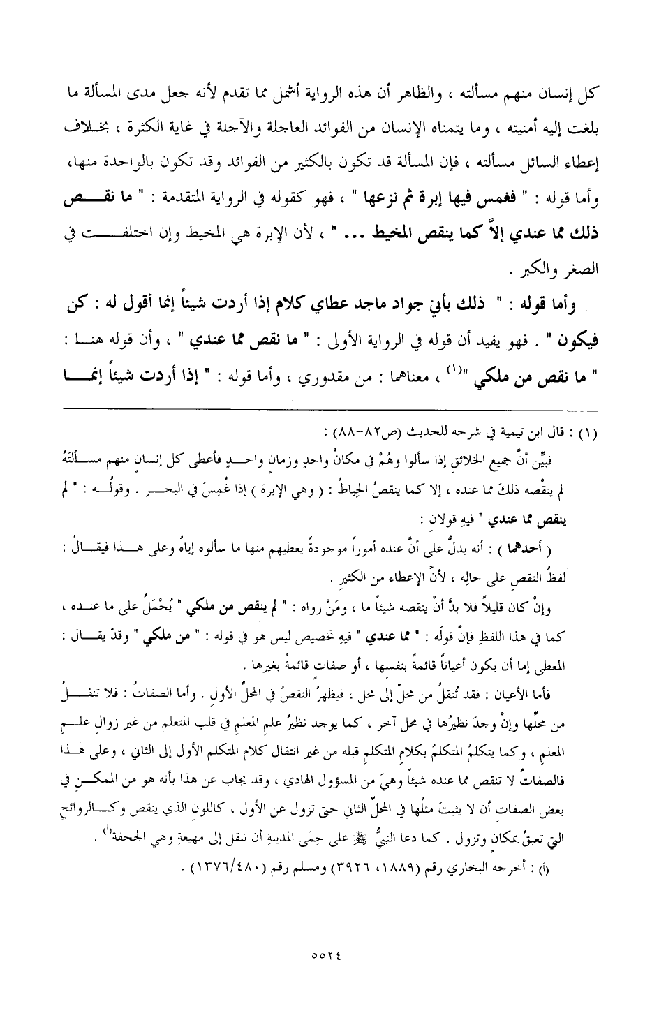 ولهذا كل أحد يعلم أن المعلم لا يزول علمه بالتعليم، بل يشبهونه بضوء السراج الذي يحدث يقتبس منه كل أحد ويأخذون ما شاءوا من الشهب وهو باق بحاله. وهذا تمثيل مطابق، فإن المستوقد من السراج يحدث الله في فتيلته أو وقوده نارا من جنس تلك النار، وإن كان قد يقال أنها تستحيل عن ذلك الهواء مع أن النار الأولى باقية. كذلك المتعلم يجعل في قلبه مثل علم المعلم مع بقاء علم المعلم، ولهذا قال علي رضي الله عنه: العلم يزكو على العمل أو قال: على التعليم والمال ينقصه النفقة، وعلى هذا فيقال في حديث أبي ذر أن قوله: " مما عندي" وقوله:" من ملكي" هو من هذا الباب وحينئذ فله وجهان: (أحدهما): أن يكون ما أعطاهم خارجا عن مسمى ملكه ومسمى ما عنده، كما أن علم الله لا يدخل فيه نفس علم موسى والخضر.