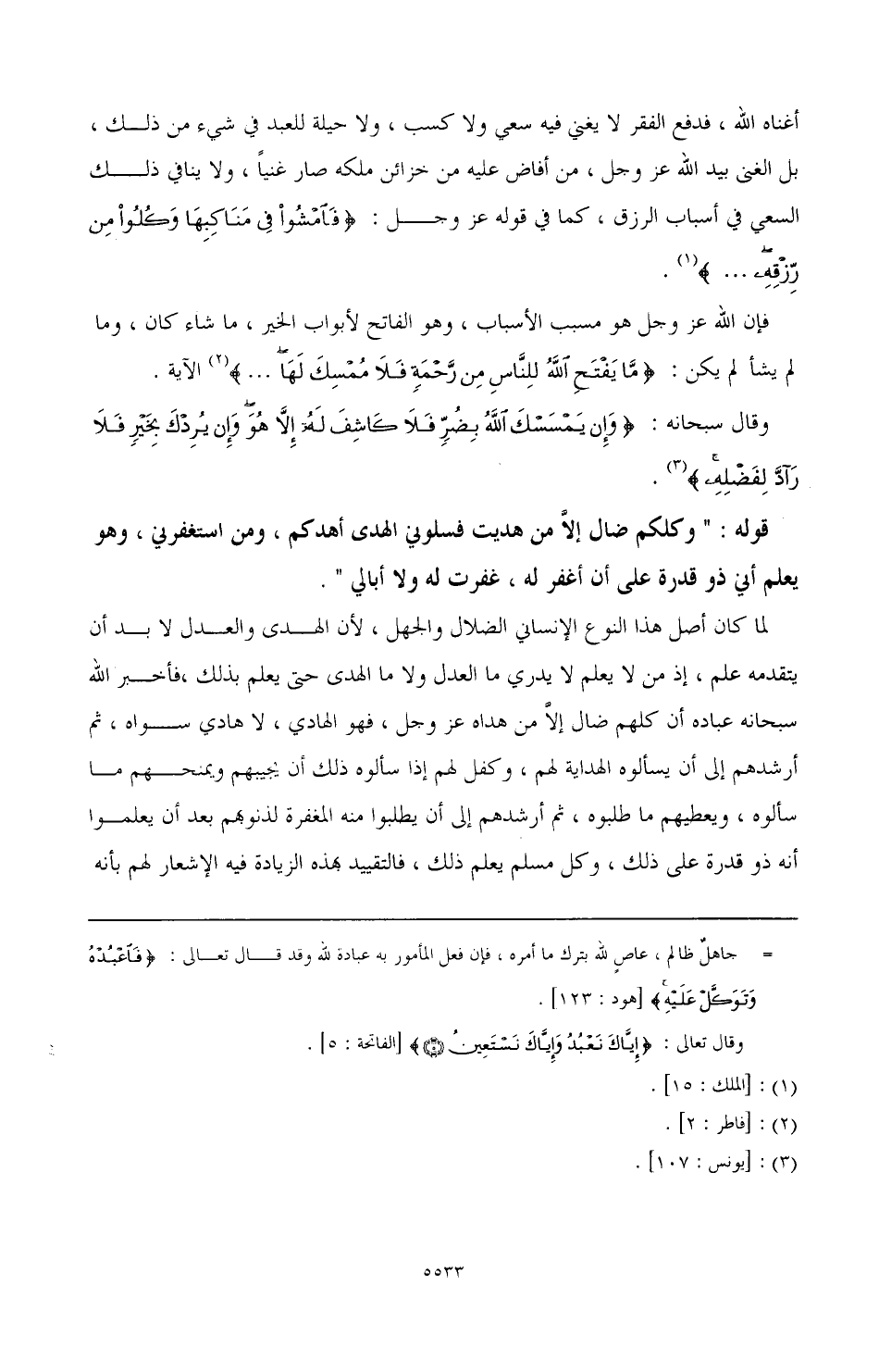 وقال سبحانه: {وَإِنْ يَمْسَسْكَ اللَّهُ بِضُرٍّ فَلَا كَاشِفَ لَهُ إِلَّا هُوَ وَإِنْ يُرِدْكَ بِخَيْرٍ فَلَا رَادَّ لِفَضْلِهِ} (¬3).