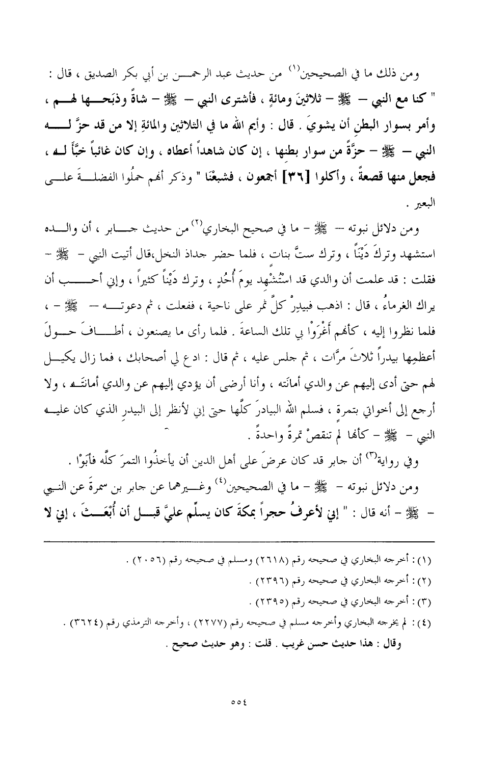 ومن دلائل نبوته -صَلَّى اللهُ عَلَيْهِ وَسَلَّمَ- ما في صحيح البخاري (¬2) من حديث جابر، أن والده استشهد وترك دينا، وترك ست بنات، فلما حضر جداد النخل، قال أتيت النبي -صَلَّى اللهُ عَلَيْهِ وَسَلَّمَ- فقلت: قد علمت أن والدي قد استشهد يوم أحد، وترك دينا كثيرا، وإني أحب أن يراك الغرماء، قال: اذهب فبيدر كل ثمر عدى ناحية، ففعلت، ثم دعوته -صَلَّى اللهُ عَلَيْهِ وَسَلَّمَ- فلما نظروا إليه، كأنهم أغروا بي تلك الساعة. فلما رأى ما يصنعون، أطاف حول أعظمها بيدرا ثلاث مرات، ثم جلس عليه، ثم قال: ادع لي أصحابك، فما زال يكيل لهم حتى أدى إليهم عن والدي أمانته، وأنا أرضى أن يؤدي إليهم عن والدي أمانته، ولا أرجع إلى أخواتي بتمرة، فسلم الله البيادر كلها حتى إني لأنظر إلى البيدر الذي كان عليه النبي -صَلَّى اللهُ عَلَيْهِ وَسَلَّمَ- كأنها لم تنقص تمرة واحدة.