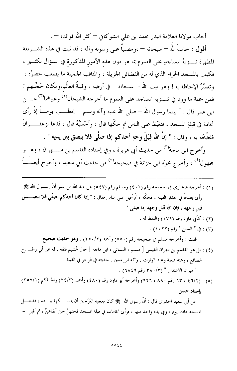 أقول: حامدا لله - سبحانه -، ومصليا على رسوله وآله - قد ثبت في هذه الشريعة المطهرة تنزيه المساجد على العموم بما هو دون هذه الأمور المذكورة في السؤال بكثير، فكيف بالمسجد الحرام الذي له من الفضائل الجزيلة، والمناقب الجميلة ما يصعب حصره، وتعسر الإحاطة به! وهو بيت الله - سبحانه - في أرضه، وقبلة العالم، ومكان حجهم! فمن جملة ما ورد في تنزيه المساجد على العموم ما أخرجه الشيخان (¬1) وغيرهما (¬2) عن ابن عمر قال:" بينما رسول الله - صَلَّى اللهُ عَلَيْهِ وَآلِهِ وَسَلَّمَ - يخطب يوما إذ رأى نخامة في قبلة المسجد، فتغيظ على الناس ثم حكها قال: وأحسبه قال: فدعا بزعفران فلطخه به، وقال:" إن الله قبل وجه أحدكم إذا صلى فلا يبصق بين يديه".