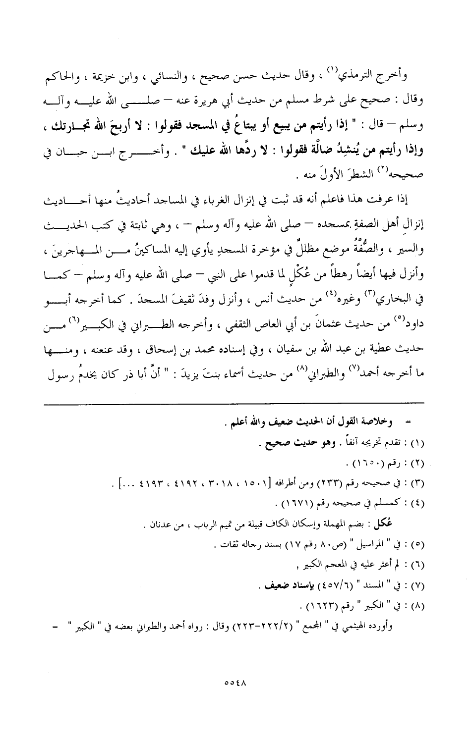 وأخرج الترمذي (¬1)، وقال حديث حسن صحيح، والنسائي، وابن خزيمة، والحاكم وقال: صحيح على شرط مسلم من حديث أبي هريرة عنه - صَلَّى اللهُ عَلَيْهِ وَآلِهِ وَسَلَّمَ - قال:" إذا رأيتم من يبيع أو يبتاع في المسجد فقولوا: لا أربح الله تجارتك، وإذا رأيتم من ينشد ضالة فقولوا: لا ردها الله عليك ". وأخرج ابن حبان في صحيحه (¬2) الشطر الأول منه.