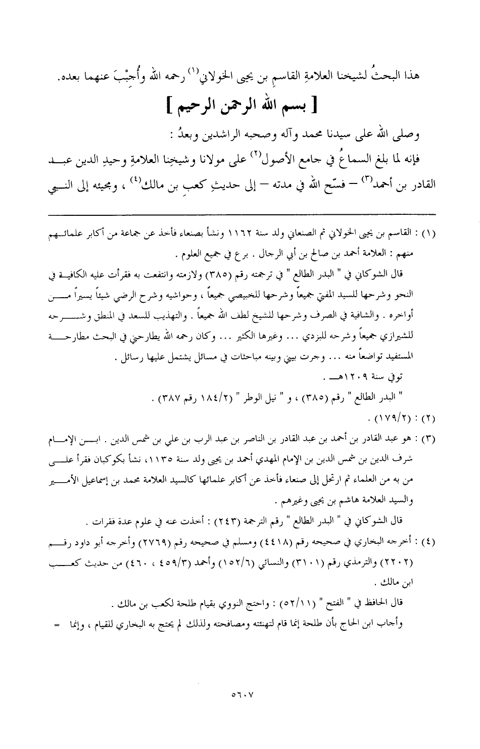 هذا البحث لشيخنا العلامة القاسم بن يحيى الخولاني (¬1) رحمه الله، وأجيب عنهما بعده.