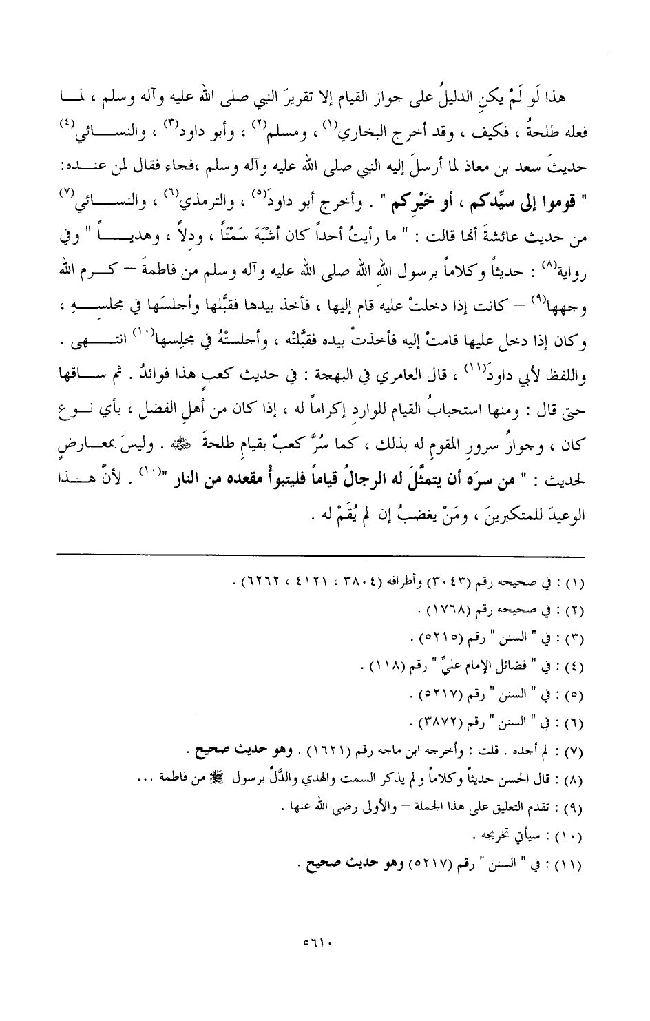 هذا لو لم يكن الدليل على جواز القيام إلا تقرير النبي - صَلَّى اللهُ عَلَيْهِ وَآلِهِ وَسَلَّمَ - لما فعله طلحة، فكيف وقد أخرج البخاري (¬1)، ومسلم (¬2)، وأبو داود (¬3)، والنسائي (¬4) حديث سعد بن معاذ لما أرسل إليه النبي - صَلَّى اللهُ عَلَيْهِ وَآلِهِ وَسَلَّمَ - فجاء، فقال لمن عنده: " قوموا إلى سيدكم، أو خيركم ". وأخرج أبو داود (¬5)، والترمذي (¬6)، والنسائي (¬7) من حديث عائشة أنها قالت: " ما رأيت أحدا كان أشبه سمتا، ودلال، وهديا " وفي رواية (¬8) حديثا وكلاما برسول الله - صَلَّى اللهُ عَلَيْهِ وَآلِهِ وَسَلَّمَ - من فاطمة - كرم الله وجهها (¬9) - كانت إذا دخلت عليه قام إليها، فأخذ بيدها فقبلها واجلسها في مجلسه، وكان إذا دخل عليها قامت إليه فأخذت بيده فقبلته، وأجلسته في مجلسها (¬10). انتهى. واللفظ لأبي داود (¬11)، قال العامري في البهجة: في حديث كعب هذا فوائد، ثم ساقها حتى قال: ومنها استحباب القيام للوارد إكراما له، إذا كان من أهل الفضل، بأي نوع كان، وجواز سرور المقول له بذلك، كما سر كعب بقيام طلحة - رضي الله عنه - وليس بمعارض لحديث: " من سره أن يتمثل له الرجال قياما فليتبوأ مقعده من النار " (¬12)؛ لأن هذا الوعيد للمتكبرين ومن يغضب إن لم يقم له.