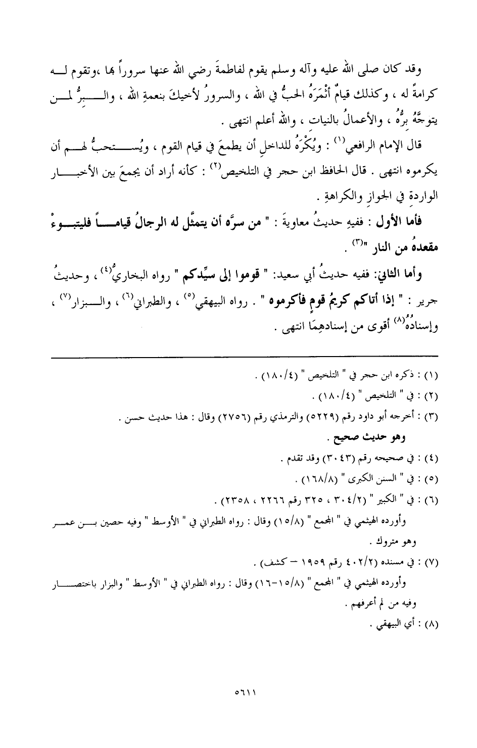 وقد كان - صَلَّى اللهُ عَلَيْهِ وَآلِهِ وَسَلَّمَ - يقوم لفاطمة - رضي الله عنها - سرورا بها، وتقوم له كرامة له، وكذلك قيام أثمره الحب في الله، والسرور لأخيك بنعمة الله، والبر لمن يتوجه بره، والأعمال بالنيات، والله أعلم. انتهى.