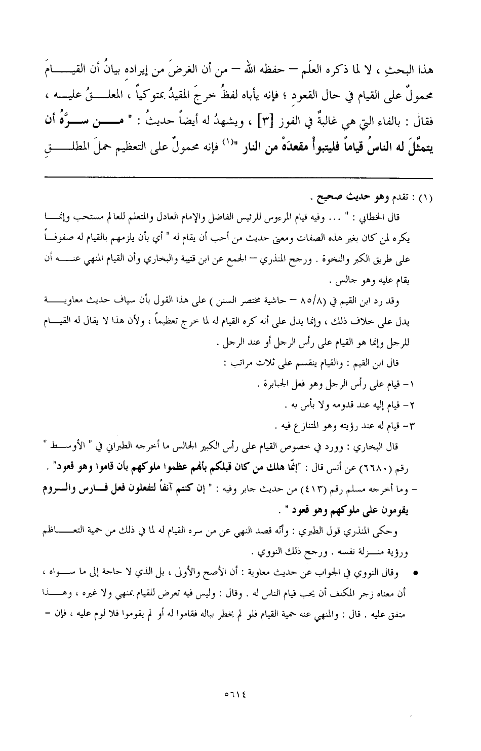 هذا البحث، لا لما ذكره العلم - حفظه الله - من أن الغرض من إيراده بيان أن القيام محمول على القيام في حال القعود؛ فإنه يأباه لفظ " خرج " المقيد بـ " متوكيا "، المعلق عليه، فقال: بالفاء التي هي غالبة في الفوز [3]، ويشهد له أيضًا حديث: " من سره أن يتمثل له الناس قياما فليتبوأ مقعده من النار " (¬1) فإنه محمول على التعظيم حمل المطلق