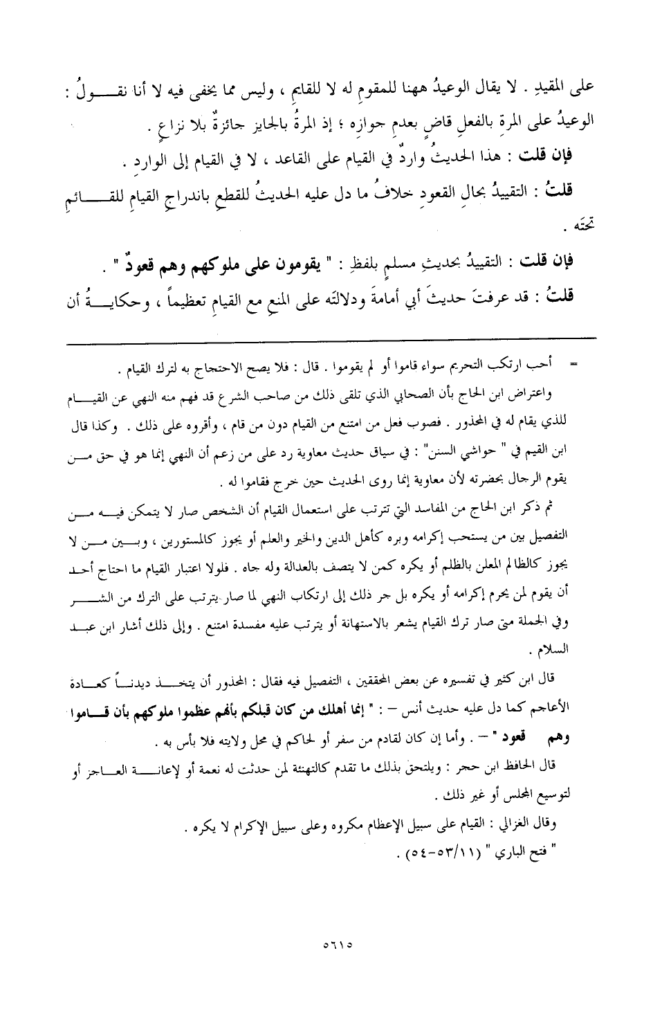 فإن قلت: التقييد بحديث مسلم بلفظ: " يقومون على ملوكهم وهم قعود ".