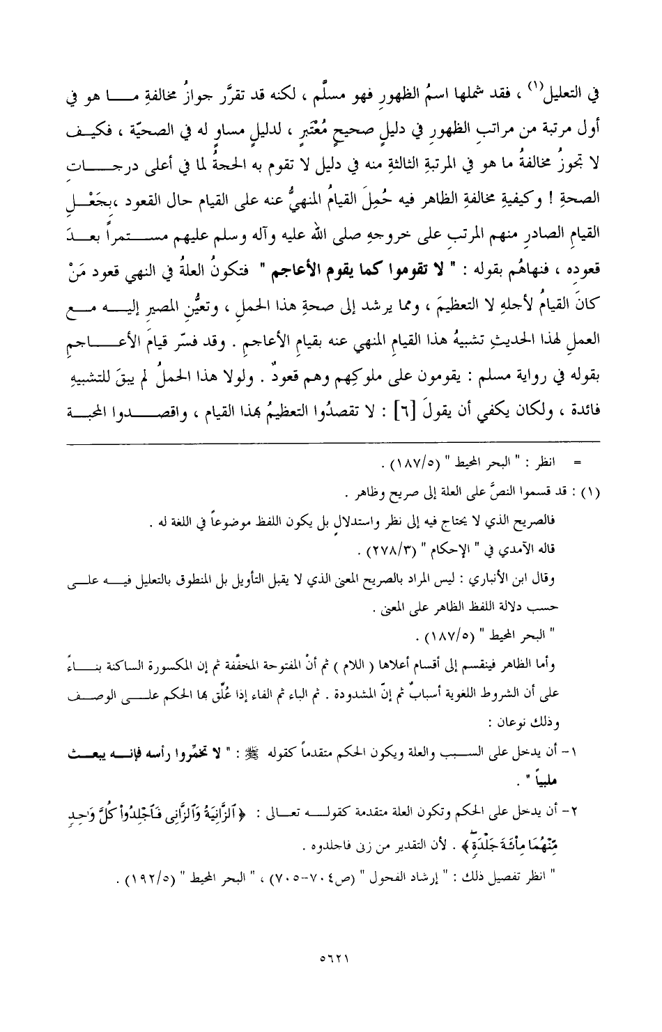 في التعليل (¬1)، فقد شملها اسم الظهور فهو مسلم، لكنه قد تقرر جواز مخالفة ما هو في أول مرتبة من مراتب الظهور في دليل صحيح معتبر لدليل مساو له في الصحية، فكيف لا تجوز مخالفة ما هو في المرتبة الثالثة منه في دليل لا تقوم به الحجة لما في أعلى درجات الصحة؟! وكيفية مخالفة الظاهر فيه حمل القيام المنهي عنه على القيام حال القعود، بجعل القيام الصادر منهم المرتب على خروجه - صَلَّى اللهُ عَلَيْهِ وَآلِهِ وَسَلَّمَ - عليهم مستمرا بعد قعوده، فنهاهم بقوله: " لا تقوموا كما يقوم الأعاجم " فتكون العلة في النهي قعود من كان القيام لأجله لا التعظيم، ومما يرشد إلى صحة هذا الحمل وتعين المصير إليه مع العمل لهذا الحديث تشبيه هذا القيام المنهي عنه بقيام الأعاجم. وقد فسر قيام الأعاجم بقوله في رواية مسلم: " يقومون على ملوكهم وهو قعود ". ولولا هذا الحمل لم يبق للتشبيه فائدة، ولكان يكفي أن يقول [6]: لا تقصدوا التعظيم بهذا القيام، واقصدوا المحبة