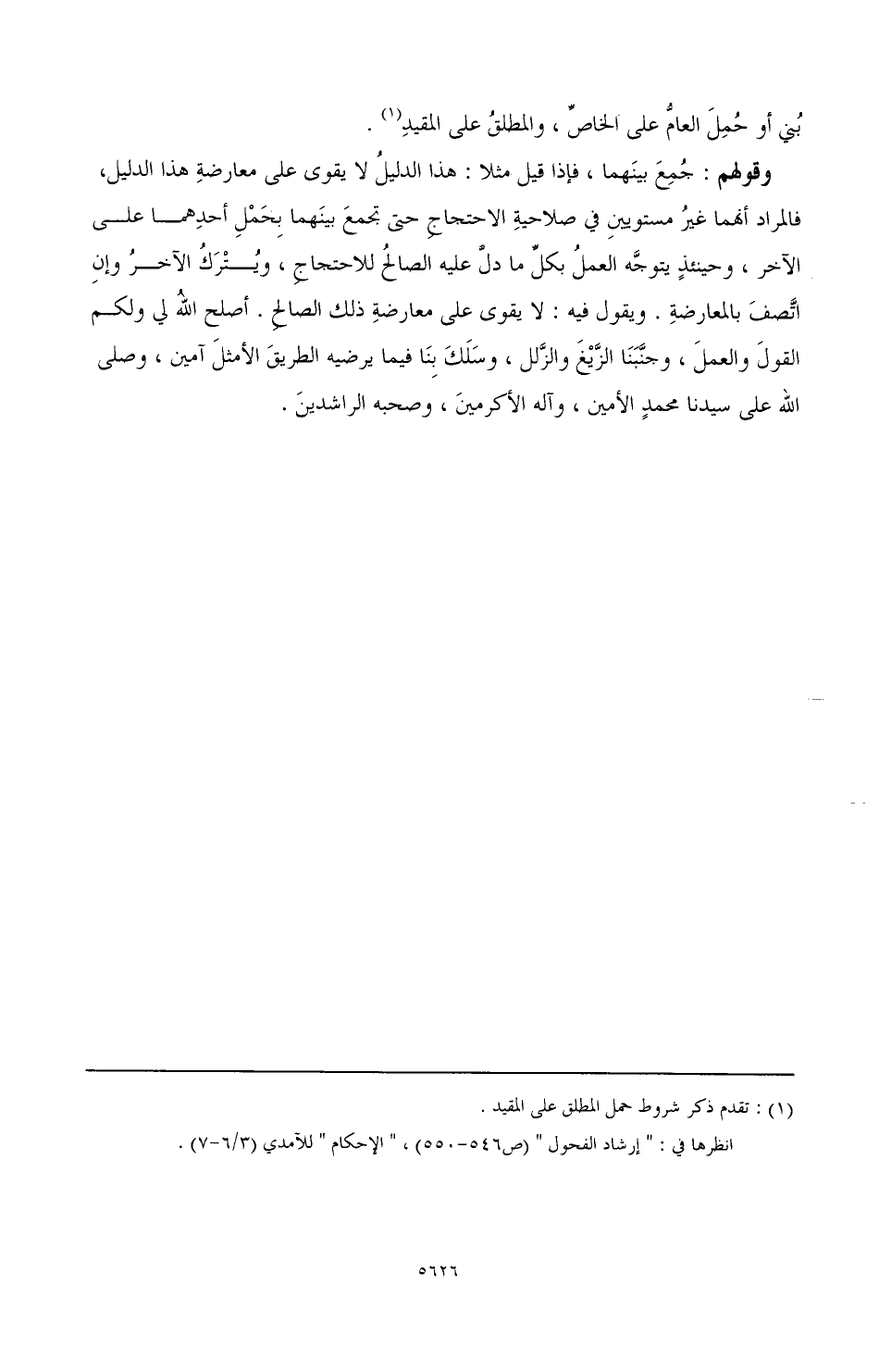 وقولهم: جمع بينهما، فإذا قيل مثلا: هذا الدليل لا يقوى على معارضة هذا الدليل، فالمراد أنهما غير مستويين في صلاحية الاحتجاج حتى تجمع بينهما بحمل أحدهما على الآخر، وحينئذ يتوجه العمل بكل ما دل عليه الصالح للاحتجاج، ويترك الآخر وإن اتصف بالمعارضة. ويقول فيه: لا يقوى على معارضة ذلك الصالح. أصلح الله لي ولكم القول والعمل، وجنبنا الزيغ والزلل، وسلك بنا فيما يرضيه الطريق الأمثل، آمين، وصلى الله على سيدنا محمد الأمين، وآله الكرمين، وصحبه الراشدين.