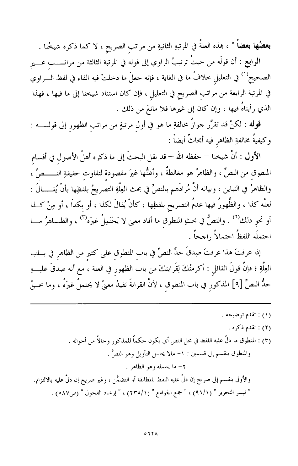 الأول: أن شيخنا - حفظه الله - قد نقل البحث إلى ما ذكره أهل الأصول في أقسام المنطوق من النص، والظاهر هو مغالطة، وأظنها غير مقصودة لتفاوت حقيقة النص، والظاهر في التباين، وبيانه أن مرادهم بالنص في بحث العلة التصريح بلفظها بأن يقال: لعله كذا، والظهور فيها عدم التصريح بلفظها، كأن يقال لكذا، أو بكذا، أو من كذا أو نحو ذلك (¬2). والنص في بحث المنطوق ما أفاد معنى لا يحتمل غيره (¬3)، والظاهر ما احتمله اللفظ احتمالا راجحا.