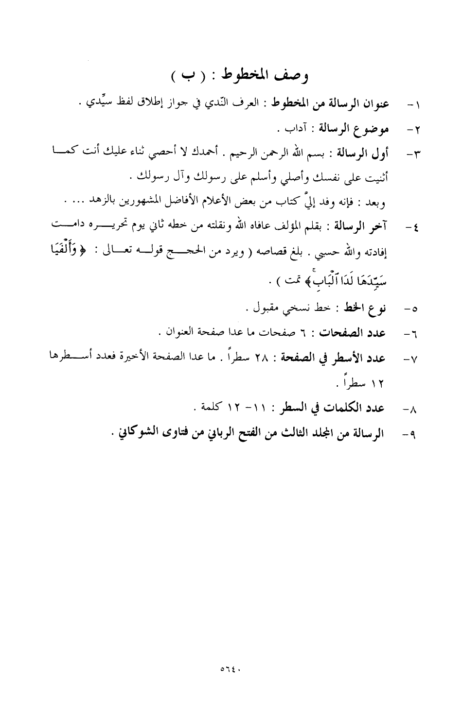 4 - آخر الرسالة: بقلم المؤلف عافاه الله، ونقلته من خطه ثاني يوم تحريره دامت إفادته، والله حسبي. بلغ قصاصه (ويرد من الحجج قوله تعالى: {وَأَلْفَيَا سَيِّدَهَا لَدَى الْبَابِ} تمت).