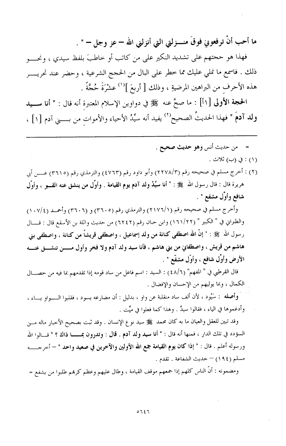 الحجة الأولى [1أ]: ما صح عنه - صَلَّى اللهُ عَلَيْهِ وَسَلَّمَ - في دواوين الإسلام المعتبرة أنه قال: " أنا سيد ولد آدم " فهذا الحديث صحيح (¬2) يفيد أنه سيد الأحياء والأموات من بني آدم [1]،