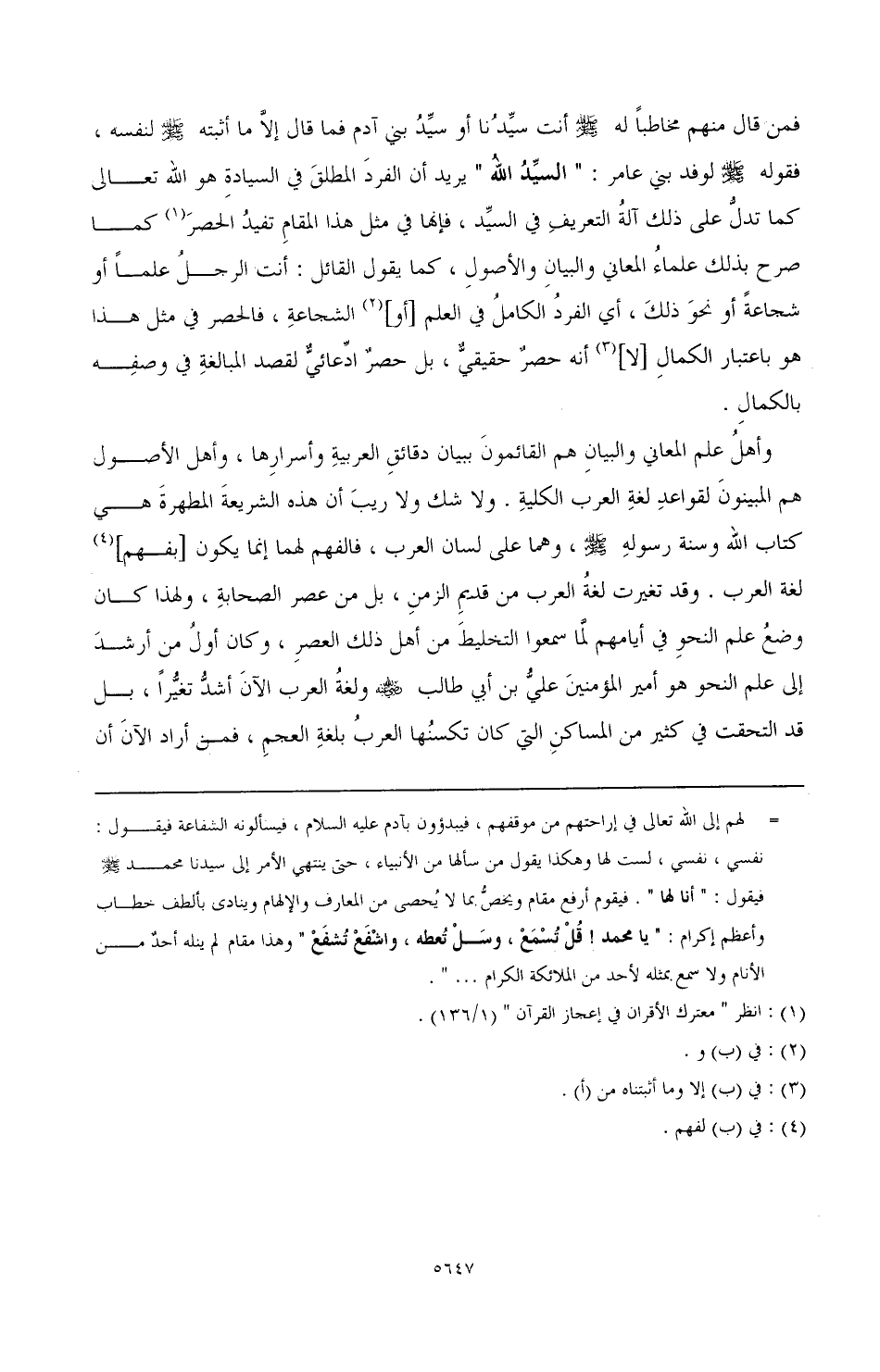 فمن قال منهم مخاطبا له - صَلَّى اللهُ عَلَيْهِ وَسَلَّمَ - أنت سيدنا أو سيد بني آدم، فما قال إلا ما أثبته - صَلَّى اللهُ عَلَيْهِ وَسَلَّمَ - لنفسه، فقوله - صَلَّى اللهُ عَلَيْهِ وَسَلَّمَ - لوفد بني عامر: " السيد الله " يريد أن الفرد المطلق في السيادة هو الله - تعالى - كما تدل على ذلك آلة التعريف في السيد، فإنها في مثل هذا المقام تفيد الحصر (¬1) كما صرح بذلك علماء المعاني والبيان والأصول، كما يقول القائل: أنت الرجل علما أو شجاعة أو نحو ذلك، أي: الفرد الكامل في العلم [أو] (¬2) الشجاعة، فالحصر في مثل هذا هو باعتبار الكمال [لا] (¬3) أنه حصر حقيقي، بل حصر ادعائي لقصد المبالغة في وصفه بالكمال.