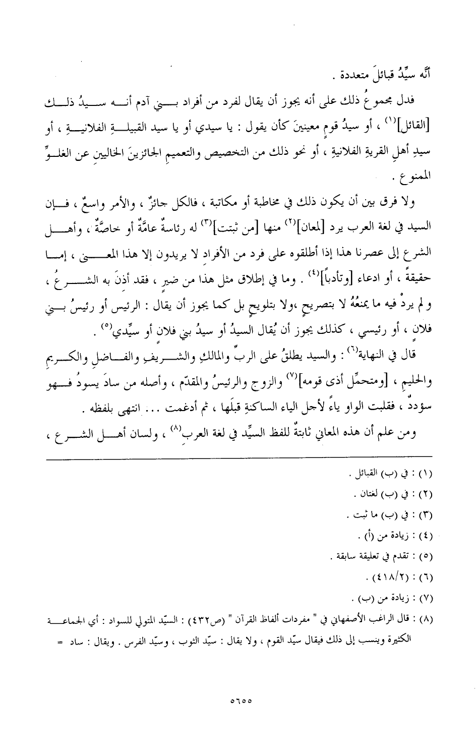 (¬8) قال الراغب الأصفهاني في " مفردات ألفاظ القرآن " (ص 432): السيد المتولي للسواد: أي الجماعة الكثيرة، وينسب إلى ذلك فيقال: سيد القوم، ولا يقال: سيد الثوب، وسيد الفرس، ويقال: ساد القوم يسودهم، ولما كان من شرط المتولي للجماعة أن يكون مهذب النفس، قيل: لكل من كان فاضلا في نفسه: سيد. وعلى ذلك قوله: {وَسَيِّدًا وَحَصُورًا} [آل عمران: 39]، وقوله: {وَأَلْفَيَا سَيِّدَهَا} [يوسف: 25] فسمي الزوج سيدا لسياسة زوجته. وقوله: {رَبَّنَا إِنَّا أَطَعْنَا سَادَتَنَا} [الأحزاب: 64]، أي: ولاتنا وسائسينا.