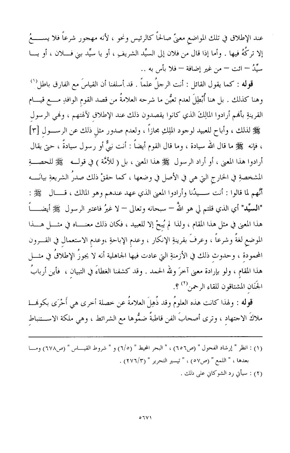 قوله: كما يقول القائل: أنت الرجل علما. قد أسلفنا أن القياس مع الفارق باطل (¬1) وهنا كذلك، بل هنا أبطل؛ لعدم تعين ما شرحه العلامة من قصد القوم الوافد، مع قيام القرينة بأنهم أرادوا المالك الذي كانوا يقصدون ذلك عند الإطلاق لآلهتهم، ونهي الرسول - صَلَّى اللهُ عَلَيْهِ وَسَلَّمَ - لذلك، وأباح للعبيد لوجود الملك مجازا، ولعدم صدور مثل ذلك عن الرسول [3]، فإنه - صَلَّى اللهُ عَلَيْهِ وَسَلَّمَ - ما قال: الله سيادة، وما قال القوم أيضا: " أنت نبي أو رسول سيادة " حتى يقال: أرادوا هذا المعنى، أو أراد الرسول - صَلَّى اللهُ عَلَيْهِ وَسَلَّمَ - هذا المعنى، بل (للأمة) في قوله - صَلَّى اللهُ عَلَيْهِ وَسَلَّمَ - للحصة المشخصة في الخارج التي هي في الأصل في وضعها، كما حقق ذلك صدر الشريعة بيانه أنهم لما قالوا: " أنت سيدنا " وأرادوا المعنى الذي عهد عندهم وهو المالك، قال - صَلَّى اللهُ عَلَيْهِ وَسَلَّمَ -: " السيد " أي: الذي قلتم لي هو الله - سبحانه وتعالى - لا غير، فاعتبر الرسول - صَلَّى اللهُ عَلَيْهِ وَسَلَّمَ - أيضًا هذا المعنى في مثل هذا المقام؛ ولذا لم يبح إلا للعبيد، فكان ذلك معناه في مثل هذا الموضع لغة وشرعا، وعرف بقرينة الإنكار وعدم الإباحة، وعدم الاستعمال في القرون المحمودة، وحدوث ذلك في الأزمنة التي عادت فيها الجاهلية أنه لا يجوز الإطلاق في مثل هذا المقام ولو بإرداة معنى آخر، ولله الحمد، وقد كشفنا الغطاء في التبيان، فأين أرباب الجنان المشتاقون للقاء الرحمن (¬2)؟