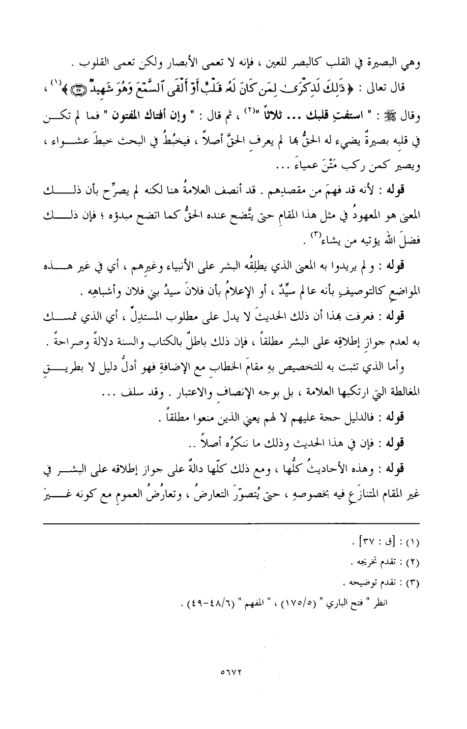 قال تعالى: {ذَلِكَ لَذِكْرَى لِمَنْ كَانَ لَهُ قَلْبٌ أَوْ أَلْقَى السَّمْعَ وَهُوَ شَهِيدٌ} (¬1)، وقال - صَلَّى اللهُ عَلَيْهِ وَسَلَّمَ -: " استفت قلبك. . . ثلاثا " (¬2)، ثم قال: " وإن أفتاك المفتون " فما لم تكن في قلبه بصيرة يضيء له الحق بها لم يعرف الحق أصلا، فيخبط في البحث خبط عشواء، ويصير كمن ركب متن عمياء ...