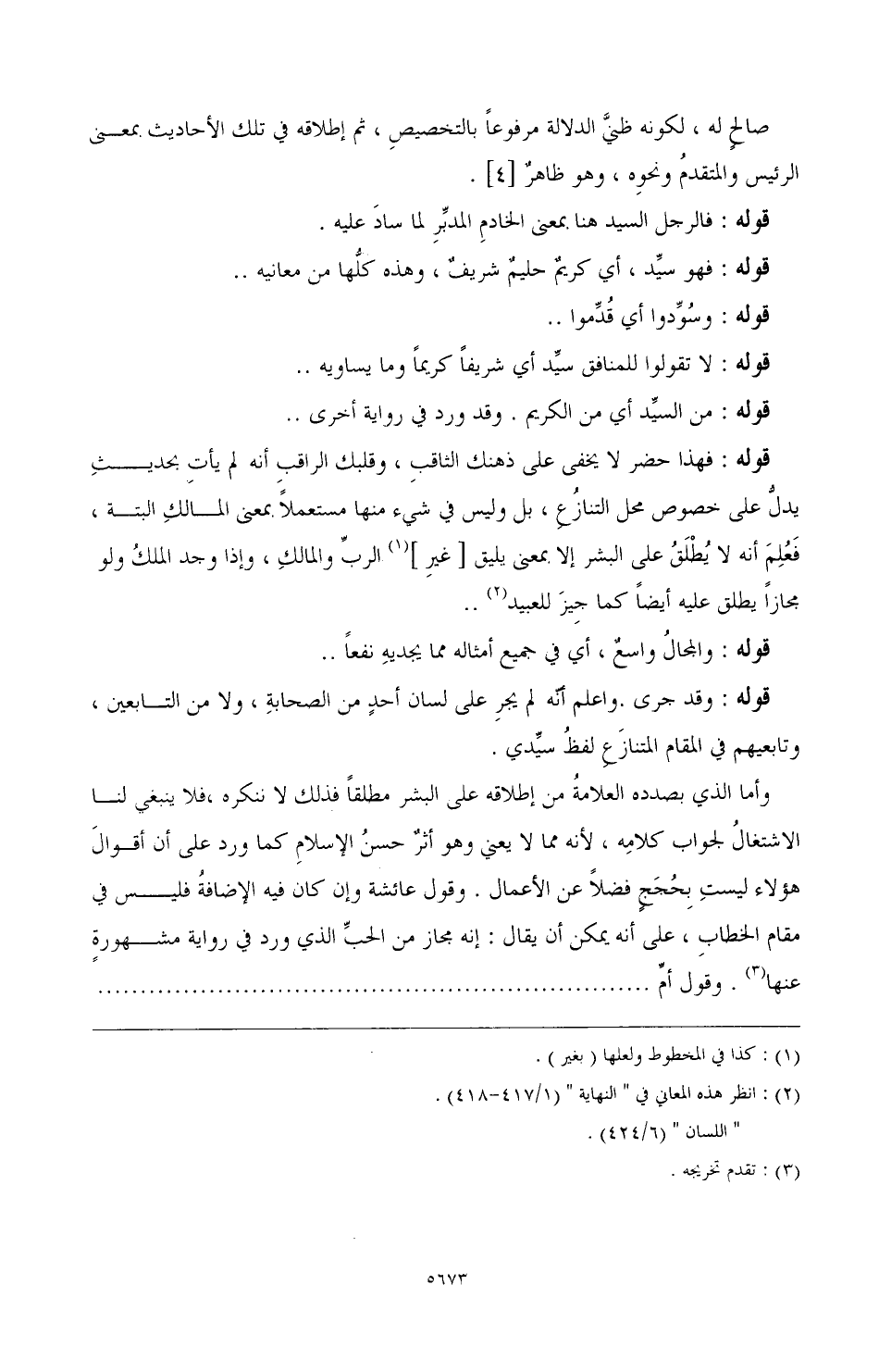 وأما الذي بصدده العلامة من إطلاقه على البشر مطلقا فذلك لا ننكره، فلا ينبغي لنا الاشتغال لجواب كلامه؛ لأنه مما لا يعني، وهو أثر حسن الإسلام كما ورد على أن أقوال هؤلاء ليست بحجج فضلا عن الأعمال، وقول عائشة وإن كان فيه الإضافة فليس في مقام الخطاب، على أنه يمكن أن يقال: إنه مجاز من الحب الذي ورد في رواية مشهورة عنها (¬3). وقول أم ..........................................