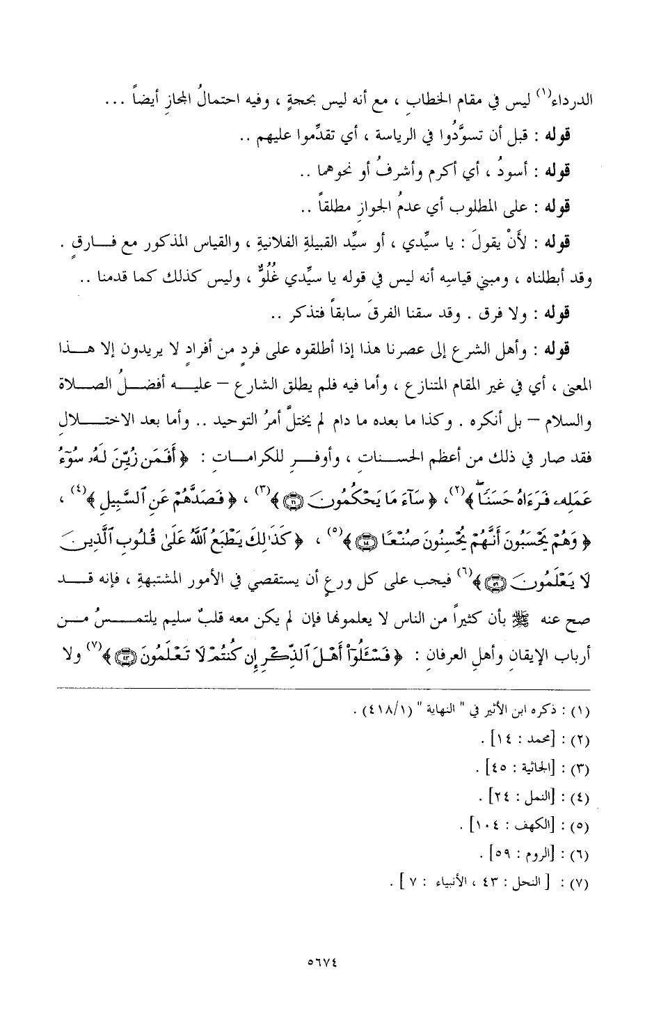 قوله: وأهل الشرع إلى عصرنا هذا إذا أطلقوه على فرد من أفراد لا يريدون إلا هذا المعنى، أي في غير المقام المتنازع، وأما فيه فلم يطلق الشارع - عليه أفضل الصلاة والسلام - بل أنكره، وكذا ما بعده، ما دام لم يختل أمر التوحيد، وأما بعد الاختلال فقد صار في ذلك من أعظم الحسنات وأوفر للكرامات: {أَفَمَنْ زُيِّنَ لَهُ سُوءُ عَمَلِهِ فَرَآَهُ حَسَنًا} (¬2)، {سَاءَ مَا يَحْكُمُونَ} (¬3)، {فَصَدَّهُمْ عَنِ السَّبِيلِ} (¬4)، {وَهُمْ يَحْسَبُونَ أَنَّهُمْ يُحْسِنُونَ صُنْعًا} (¬5)، {كَذَلِكَ يَطْبَعُ اللَّهُ عَلَى قُلُوبِ الَّذِينَ لَا يَعْلَمُونَ} (¬6) فيجب على كل ورع أن يستقصي في الأمور المشتبهة، فإنه قد صح عنه - صَلَّى اللهُ عَلَيْهِ وَسَلَّمَ - بأن كثيرا من الناس لا يعلمونها، فإن لم يكن معه قلب سليم يلتمس من أرباب الإيقان وأهل العرفان: {فَاسْأَلُوا أَهْلَ الذِّكْرِ إِنْ كُنْتُمْ لَا تَعْلَمُونَ} (¬7)، ولا