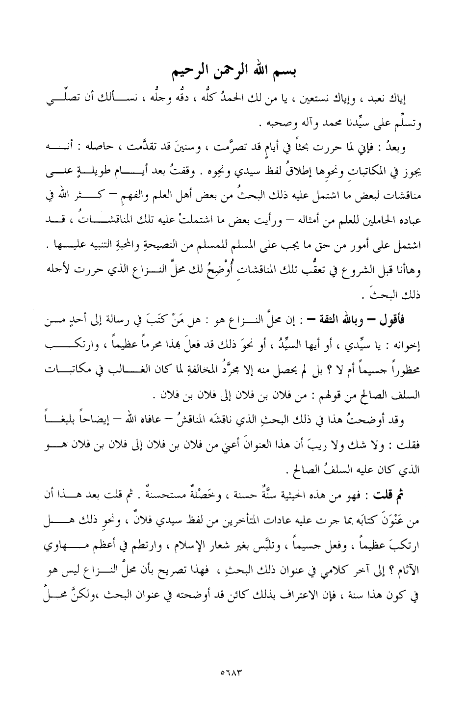 وبعد: فإني لما حررت بحثا في أيام قد تصرمت، وسنين قد تقدمت، حاصله: أنه يجوز في المكاتبات ونحوها إطلاق لفظ سيدي ونحوه. وقفت بعد أيام طويلة على مناقشات لبعض ما اشتمل عليه ذلك البحث من بعض أهل العلم والفهم - كثر الله في عباده الحاملين للعلم من أمثاله - ورأيت بعض ما اشتملت عليه تلك المناقشات، قد اشتمل على أمور من حق ما يجب على المسلم للمسلم من النصيحة والمحبة التنبيه عليها.