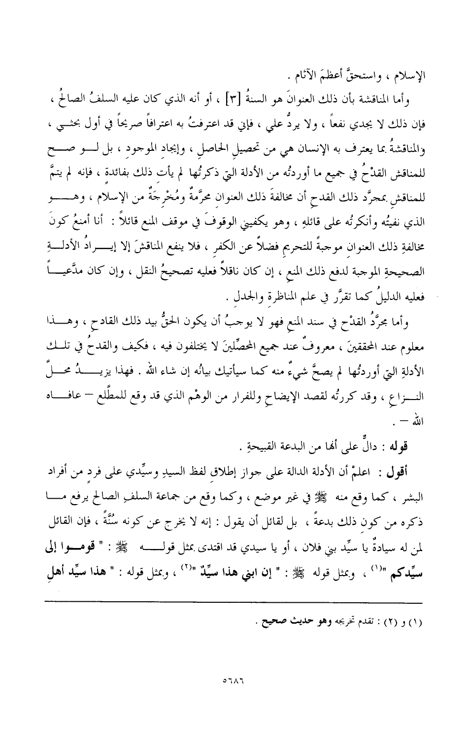 وأما المناقشة بأن ذلك العنوان هو السنة [3]، أو أنه الذي كان عليه السلف الصالح، فإن ذلك لا يجدي نفعا، ولا يرد علي، فإني قد اعترفت به اعترافا صريحا في أول بحثي، والمناقشة بما يعترف به الإنسان هي من تحصيل الحاصل، وإيجاد الموجود، بل لو صح للمناقش القدح في جميع ما أوردته من الأدلة التي ذكرتها لم يأت ذلك بفائدة، فإنه لم يتم للمناقش بمجرد ذلك القدح أن مخالفة ذلك العنوان محرمة ومخرجة من الإسلام، وهو الذي نفيته وأنكرته على قائله، وهو يكفيني الوقوف في موقف المنع قائلا: أنا أمنع كون مخالفة ذلك العنوان موجبة للتحريم فضلاَ عن الكفر، فلا ينفع المناقش إلا إيراد الأدلة الصحيحة الموجبة لدفع ذلك المنع، إن كان ناقلا فعليه تصحيح النقل، وإن كان مدعيا فعليه الدليل كما تقرر في علم المناظرة والجدل.