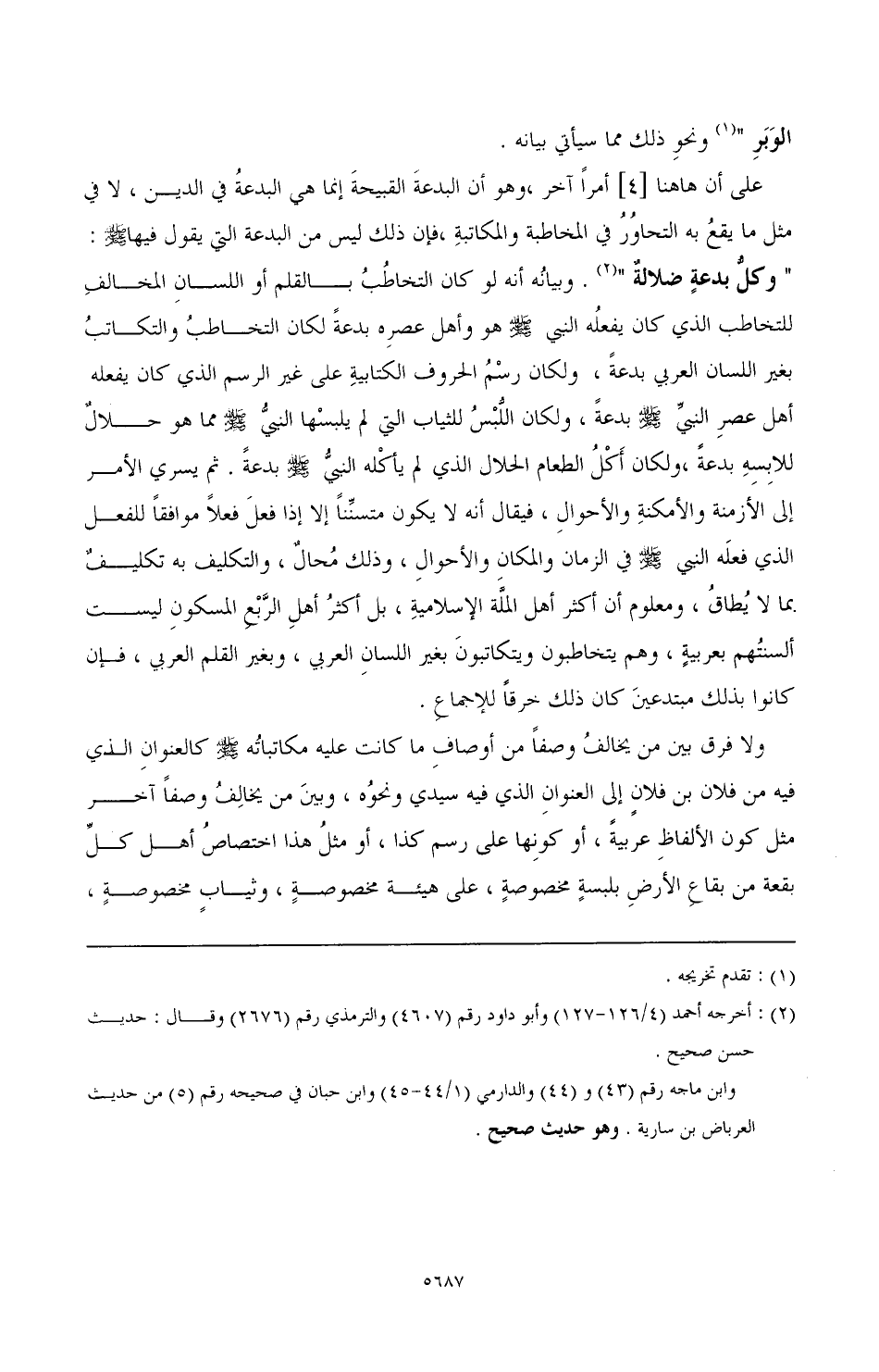 على أن هاهنا [4] أمرا آخر، وهو أن البدعة القبيحة إنما هي البدعة في الدين، لا في مثل ما يقع به التحاور في المخاطبة والمكاتبة، فإن ذلك ليس من البدعة التي يقول فيها صَلَّى اللهُ عَلَيْهِ وَسَلَّمَ: " وكل بدعة ضلالة" (¬2). وبيانه أنه لو كان التخاطب بالقلم أو اللسان المخالف للتخاطب الذي كان يفعله النبي صَلَّى اللهُ عَلَيْهِ وَسَلَّمَ هو وأهل عصره بدعة لكان التخاطب والتكاتب بغير اللسان العربي بدعة، ولكان رسم الحروف الكتابية على غير الرسم الذي كان يفعله أهل عصر النبي صَلَّى اللهُ عَلَيْهِ وَسَلَّمَ بدعة، ولكان اللبس للثياب التي لم يلبسها النبي صَلَّى اللهُ عَلَيْهِ وَسَلَّمَ مما هو حلال للابسه بدعة، ولكان أكل الطعام الحلال الذي لم يأكله النبي صَلَّى اللهُ عَلَيْهِ وَسَلَّمَ بدعة. ثم يسري الأمر إلى الأزمنة والأمكنة والأحوال، فيقال إنه لا يكون متسننا إلا إذا فعل فعلا موافقا للفعل الذي فعله النبي صَلَّى اللهُ عَلَيْهِ وَسَلَّمَ في الزمان والمكان والأحوال، وذلك محال، والتكليف به تكليف بما لا يطاق، ومعلوم أن أكثر أهل الملة الإسلامية، بل أكثر أهل الربع المسكون ليست ألسنتهم بعربية، وهم يتخاطبون ويتكاتبون بغير اللسان العربي، وبغير القلم العربي، فإن كانوا بذلك مبتدعين كان ذلك خرقا للإجماع.