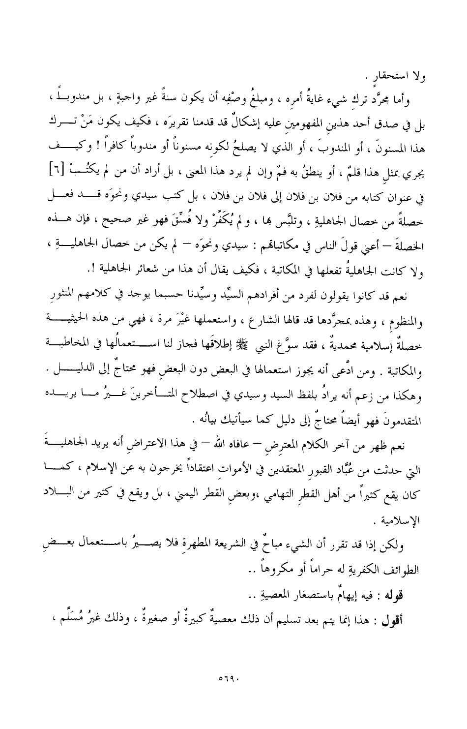 وأما مجرد ترك شيء غاية أمره، ومبلغ وصفه أن يكون سنة غير واجبة، بل مندوبا، بل في صدق أحد هذين المفهومين عليه إشكال قد قدمنا تقريره، فكيف يكون من ترك هذا المسنون، أو المندوب، أو الذي لا يصلح لكونه مسنونا أو مندوبا كافرا! وكيف يجري بمثل هذا قلم، أو ينطق به فم وإن لم يرد هذا المعنى، بل أراد أن من لم يكتب [6] في عنوان كتابه من فلان بن فلان إلى فلان بن فلان، بل كتب سيدي ونحوه قد فعل خصلة من خصال الجاهلية، وتلبس بها، ولم يكفر ولا فسق فهو غير صحيح، فإن هذه الخصلة - أعني قول الناس في مكاتباتهم: سيدي ونحوه - لم يكن من خصال الجاهلية، ولا كانت الجاهلية تفعلها في المكاتبة، فكيف يقال أن هذا من شعائر الجاهلية!.