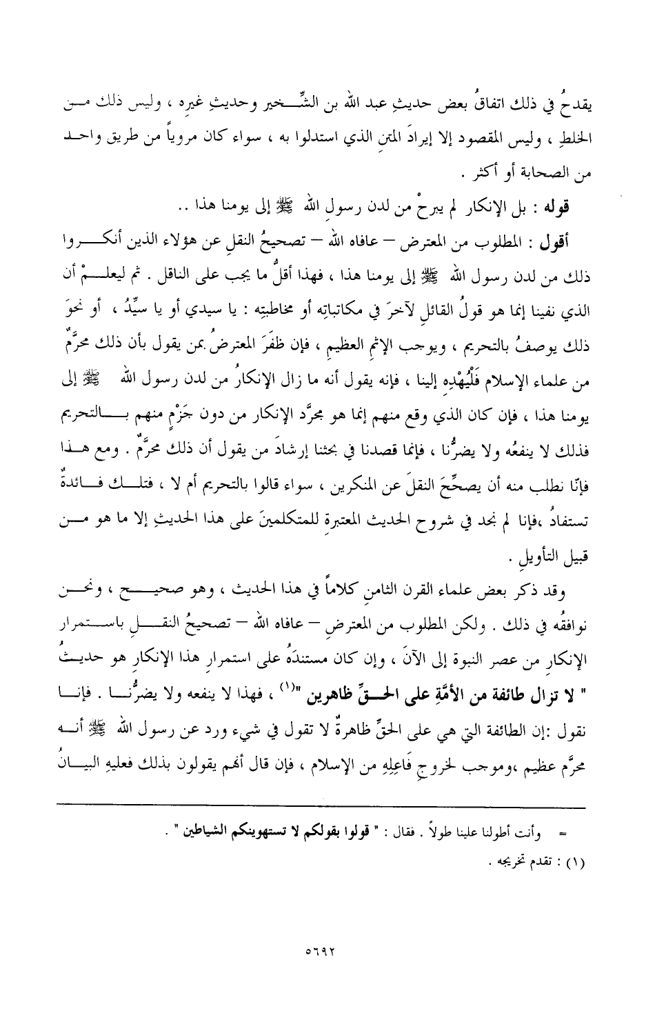وقد ذكر بعض علماء القرن الثامن كلاما في هذا الحديث، وهو صحيح، ونحن نوافقه في ذلك. ولكن المطلوب من المعترض - عافاه الله - تصحيح النقل باستمرار الإنكار من عصر النبوة إلى الآن، وإن كان مستنده على استمرار هذا الإنكار هو حديث "لا تزال طائفة من الأمة على الحق ظاهرين" (¬1)، فهذا لا ينفعه ولا يضرنا، فإنا نقول: إن الطائفة التي هي على الحق ظاهرة لا تقول في شيء ورد عن رسول الله صَلَّى اللهُ عَلَيْهِ وَسَلَّمَ أنه محرم عظيم، وموجب لخروج فاعله من الإسلام، فإن قال إنهم يقولون بذلك فعليه البيان