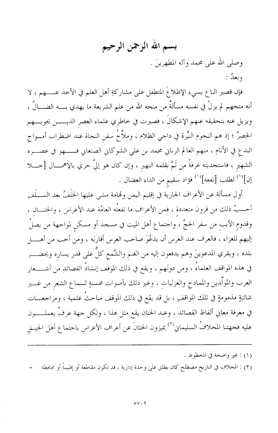 أول مسألة عن الأعراف الجارية في إقليم اليمن وتهامة مشى عليها الخلف بعد السلف أحسب ذلك من قرون متعددة. فمن الأعراف ما تفعله العامة عند الأعراس، والختان، وقدوم الآيب من سفر الحج، واجتماع أهل الميت في مسجد أو مسكن لمواجهة من يصل إليهم للعزاء. فالعرف عند العرس أن يدعو صاحب العرس أقاربه، ومن أحب من أهل بلده، ويقري المدعوين وهم يدفعون إليه من الغنم والشمع كل على قدر يساره، ويحضر في هذه المواقف العلماء ومن دونهم، ويقع في ذلك الموقف إنشاد القصائد من أشعار العرب والمولدين والممادح والغزليات، وغير ذلك بأصوات محسنة لسماع الشعر من غير شائبة مذمومة في تلك المواقف. بل قد يقع في ذلك الموقف مباحث علمية، ومراجعات في معرفة معاني ألفاظ القصائد، وعند الختان يقع مثل هذا، ولكل جهة عرف يعملون عليه، فجهتنا المخلاف السليماني (¬3) يميزون الختان عن أعراف الأعراس باجتماع أهل الخيل