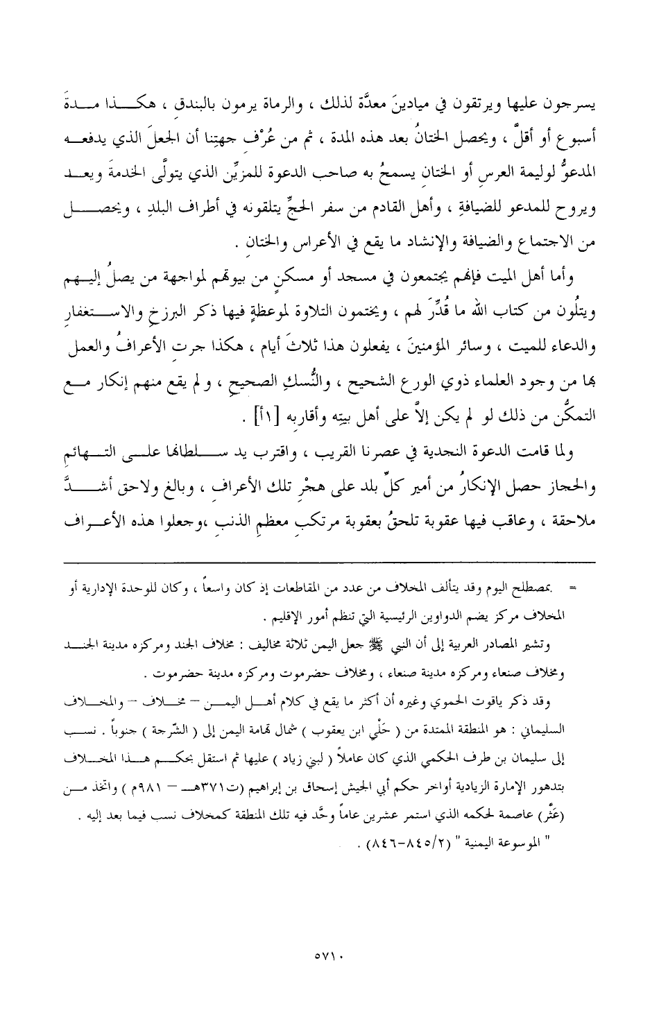 يسرجون عليها ويرتقون في ميادين معدة لذلك. والرماة يرمون بالبندق. هكذا مدة أسبوع أو أقل. ويحصل الختان بعد هذه المدة. ثم من عرف جهتنا أن الجعل الذي يدفعه المدعو لوليمة العرس أو الختان يسمح به صاحب الدعوة للمزين الذي يتولى الخدمة ويعد ويروح للمدعو للضيافة، وأهل القادم من سفر الحج يتلقونه في أطراف البلد، ويحصل من الاجتماع والضيافة والإنشاد ما يقع في الأعراس والختان.