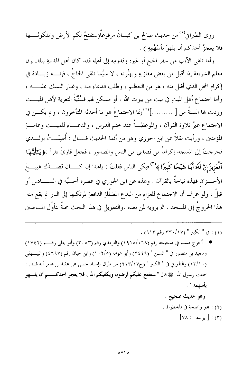 وأما تلقي الآيب من سفر الحج أو غيره وقدومه إلى أهله فقد كان أهل المدينة يتلقون معلم الشريعة إذا أقبل من بعض مغازيه ويهنونه، لا سيما تلقى الحاج، فإنه زيادة في إكرام المحل الذي أقبل منه، هو من التعظيم، وطلب الدعاء منه، وغبار النسك عليه، وأما اجتماع أهل الميت في بيت من بيوت الله، أو مسكن لهم فسنية التعزية لأهل الميت وردت بها السنة من [. . . . . . . . . .] (¬2) إنما الاجتماع هو ما أحدثه المتأخرون، ولم يكن في الاجتماع غير تلاوة القرآن، والموعظة عند ختم الدرس، والدعاء للميت وعامة المؤمنين، ورأيت نقلا عن ابن الجوزي وهو من أئمة الحديث قال: أصبت بولدي فخرجت إلى المسجد إكراما لمن قصدني من الناس والصدور، فجعل قارئ يقرأ: {يَا أَيُّهَا الْعَزِيزُ إِنَّ لَهُ أَبًا شَيْخًا كَبِيرًا} (¬3) فبكى الناس فقلت: يا هذا إن كان قصدك تهييج الأحزان فهذه نياحة بالقرآن، وهذه عن ابن الجوزي في عصره أحسبه في السادس أو قبل، ولو عرف أن الاجتماع للعزاء من البدع المضللة الدافعة لمرتكبها إلى النار لم يقع منه هذا الخروج إلى المسجد، ثم يرويه لمن بعده، والتطويل في هذا البحث محبة لتأول الماضين