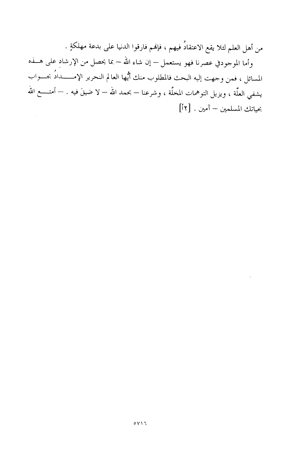 وأما الموجود في عصرنا فهو يستعمل - إن شاء الله - بما يحصل من الإرشاد على هذه المسائل، فمن وجهت إليه البحث فالمطلوب منك أيها العالم النحرير الإمداد بجواب يشفي العلة، ويزيل التوهمات المخلة، وشرعنا - بحمد الله - لا ضيق فيه - أمتع الله بحياتك المسلمين - آمين. [2أ].