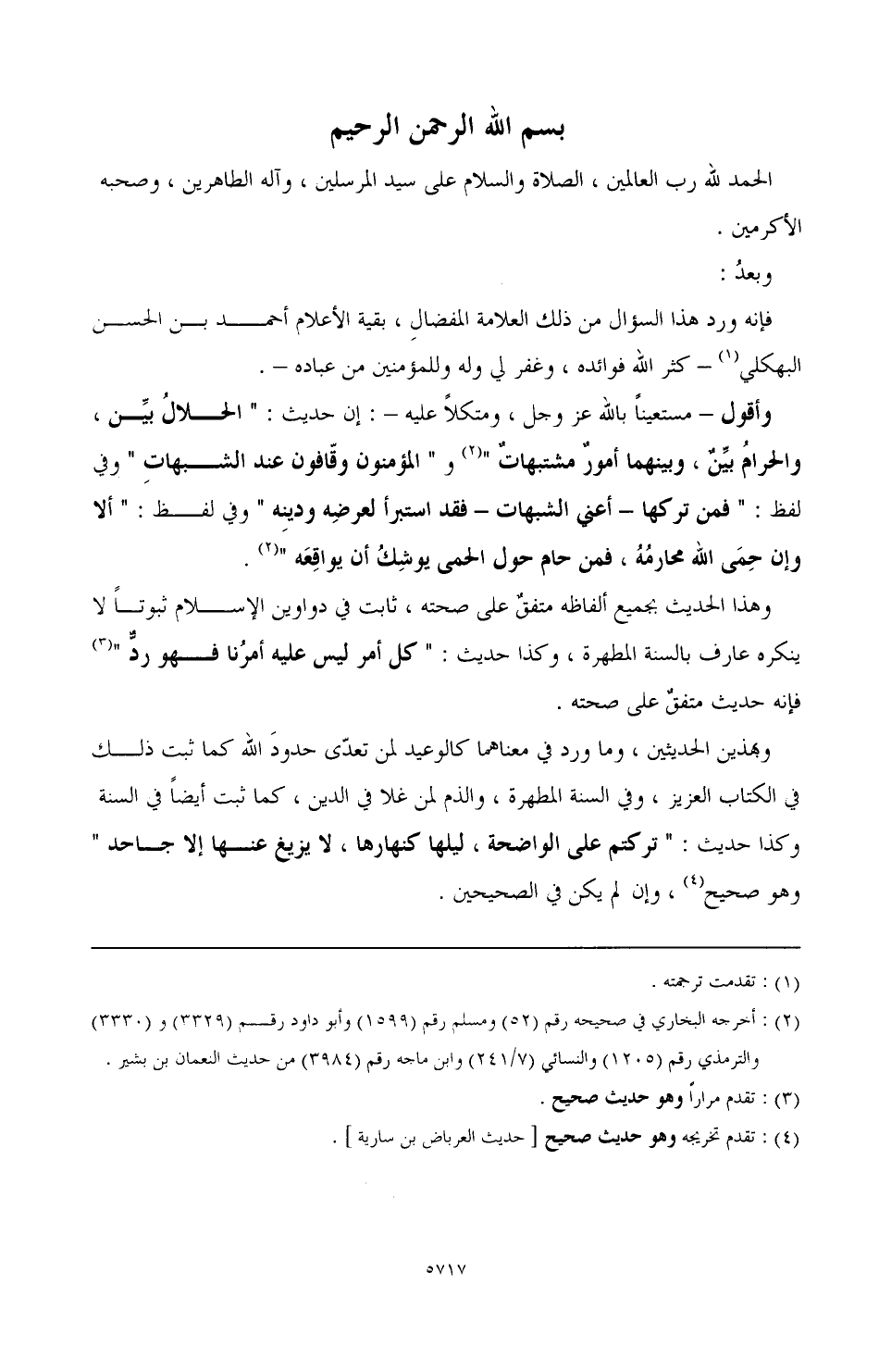 وأقول - مستعينا بالله عز وجل، ومتكلا عليه -: إن حديث: " الحلال بين والحرام بين، وبينهما أمور مشتبهات" (¬2) و" المؤمنون وقافون عند الشبهات " وفي لفظ: " فمن تركها - أعني الشبهات - فقد استبرأ لعرضه ودينه " وفي لفظ: " ألا وإن حمى الله محارمه، فمن حام حول الحمى يوشك أن يواقعه (¬3).