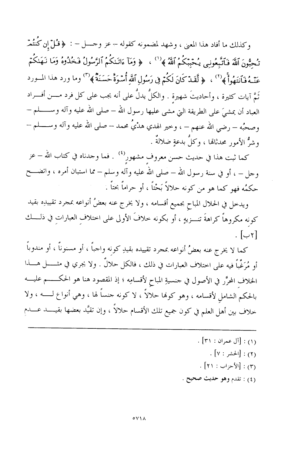 وكذلك ما أفاد هذا المعنى، وشهد لمضمونه كقوله - عز وجل -: {قُلْ إِنْ كُنْتُمْ تُحِبُّونَ اللَّهَ فَاتَّبِعُونِي يُحْبِبْكُمُ اللَّهُ} (¬1)، {وَمَا آَتَاكُمُ الرَّسُولُ فَخُذُوهُ وَمَا نَهَاكُمْ عَنْهُ فَانْتَهُوا} (¬2)، {لَقَدْ كَانَ لَكُمْ فِي رَسُولِ اللَّهِ أُسْوَةٌ حَسَنَةٌ} (¬3) وما ورد هذا المورد ثم آيات كثيرة، وأحاديث شهيرة، والكل يدل على أنه يجب على كل فرد من أفراد العباد أن يمشي على الطريقة التي مشى عليها رسول الله - صَلَّى اللهُ عَلَيْهِ وَآلِهِ وَسَلَّمَ - وصحبه - رضي الله عنهم -، وخير الهدي هدي محمد - صَلَّى اللهُ عَلَيْهِ وَآلِهِ وَسَلَّمَ - وشر الأمور محدثاتها، وكل بدعة ضلالة.