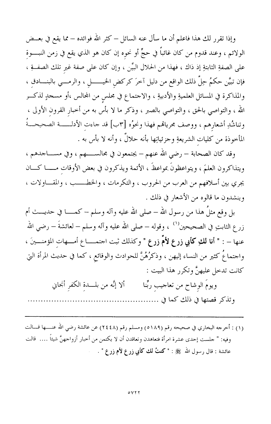 بل وقع مثل هذا من رسول الله - صَلَّى اللهُ عَلَيْهِ وَآلِهِ وَسَلَّمَ - كما في حديث أم زرع الثابت في الصحيحين (¬1)، وقوله - صَلَّى اللهُ عَلَيْهِ وَآلِهِ وَسَلَّمَ - لعائشة - رضي الله عنها -: "أنا لك كأبي زرع لأم زرع" وكذلك ثبت اجتماع أمهات المؤمنين، واجتماع كثير من النساء إليهن، وذكرهن للحوادث والوقائع، كما في حديث المرأة التي كانت تدخل عليهن وتكرر هذا البيت: