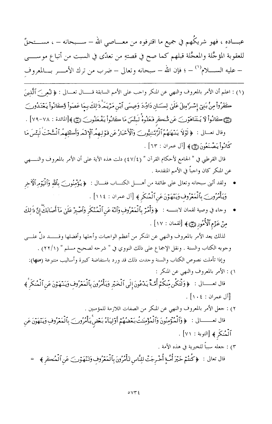 (¬1) اعلم أن الأمر بالمعروف والنهي عن المنكر واجب على الأمم السابقة قال تعالى: (لُعِنَ الَّذِينَ كَفَرُوا مِنْ بَنِي إِسْرَائِيلَ عَلَى لِسَانِ دَاوُودَ وَعِيسَى ابْنِ مَرْيَمَ ذَلِكَ بِمَا عَصَوْا وَكَانُوا يَعْتَدُونَ كَانُوا لَا يَتَنَاهَوْنَ عَنْ مُنْكَرٍ فَعَلُوهُ لَبِئْسَ مَا كَانُوا يَفْعَلُونَ) [المائدة: 78 - 79].